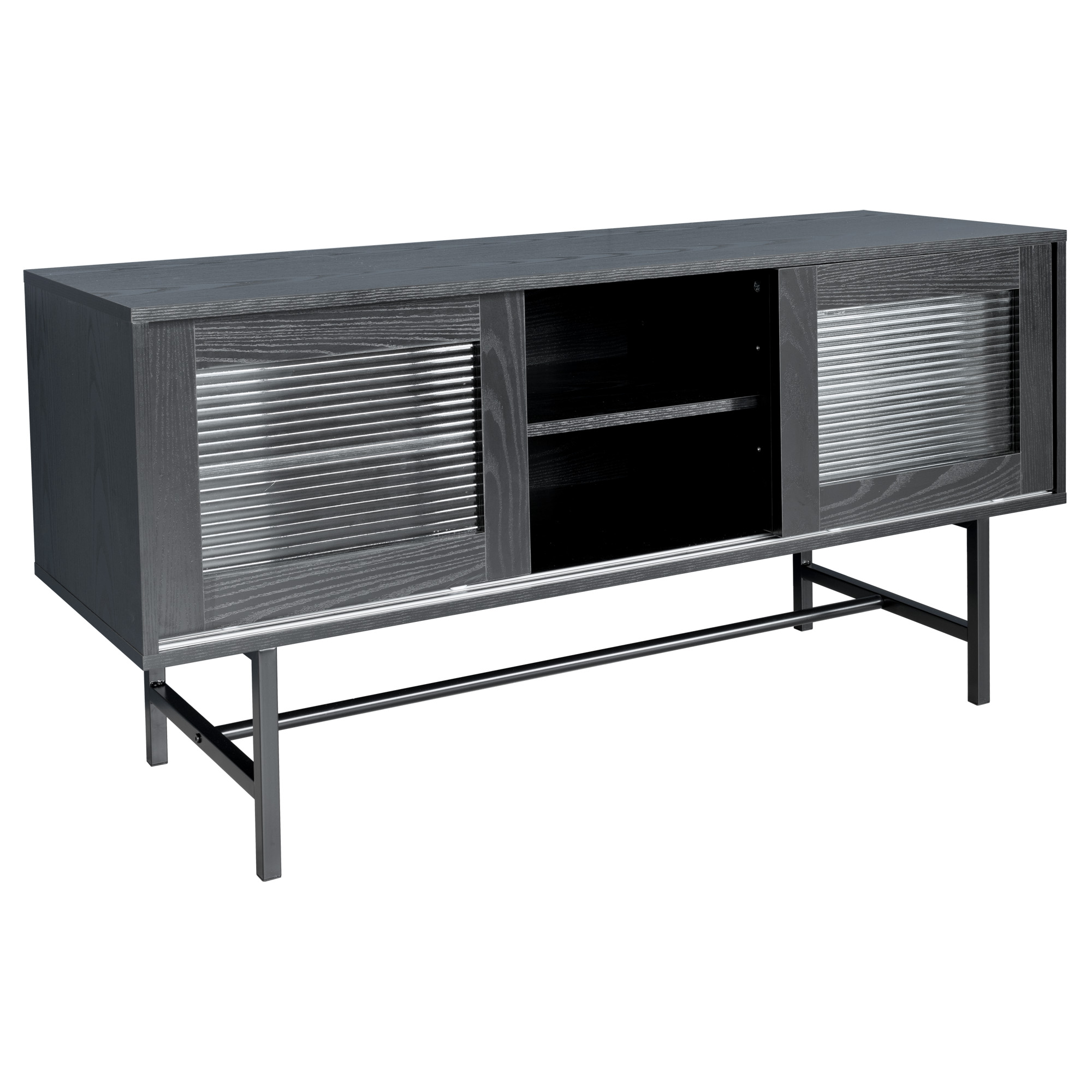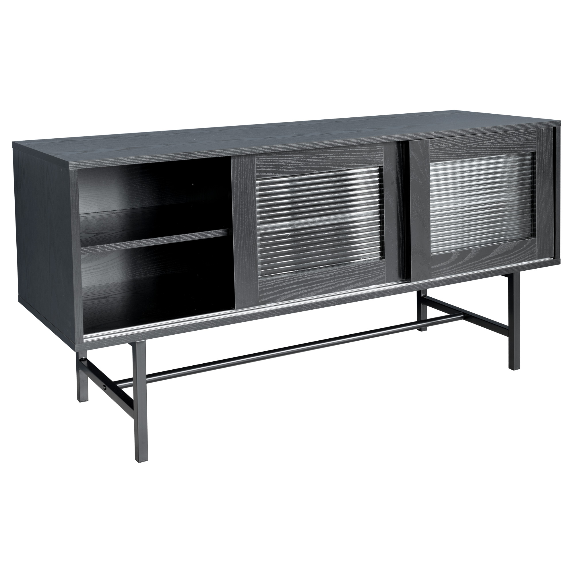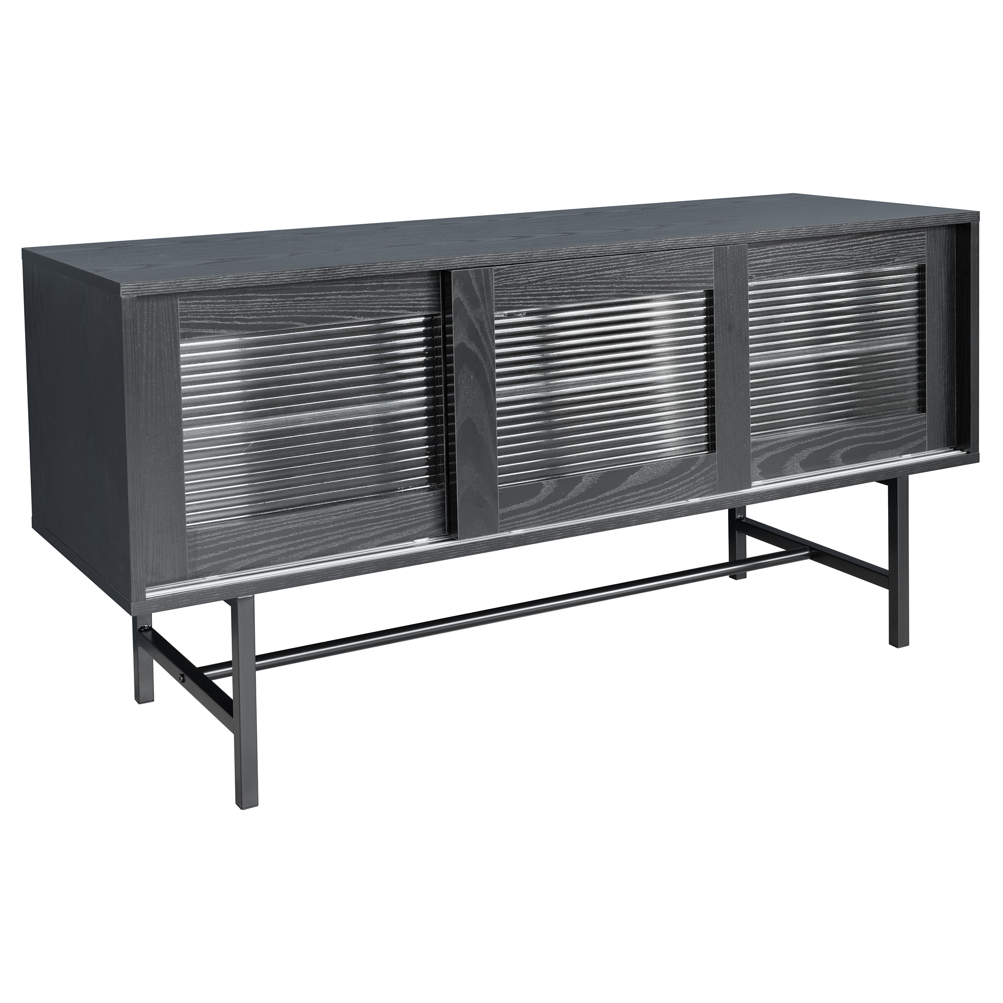 A simple black entertainment unit with a wood veneer finish, the unit has three sliding doors with corrugated glass windows supported by a black metal frame. Providing extra storage space and an extra surface to display your TV, home decor, ornaments and giftware items.