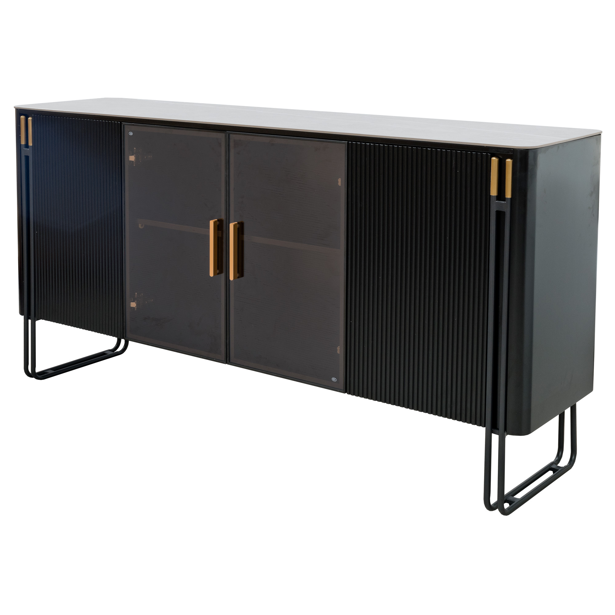 A fabulous piece of modern furniture perfect for the home interior, the sideboard has a marble effect top, two doors with tinted glass windows and 2 black doors at each side for extra storage supported by a black frame with gold features.