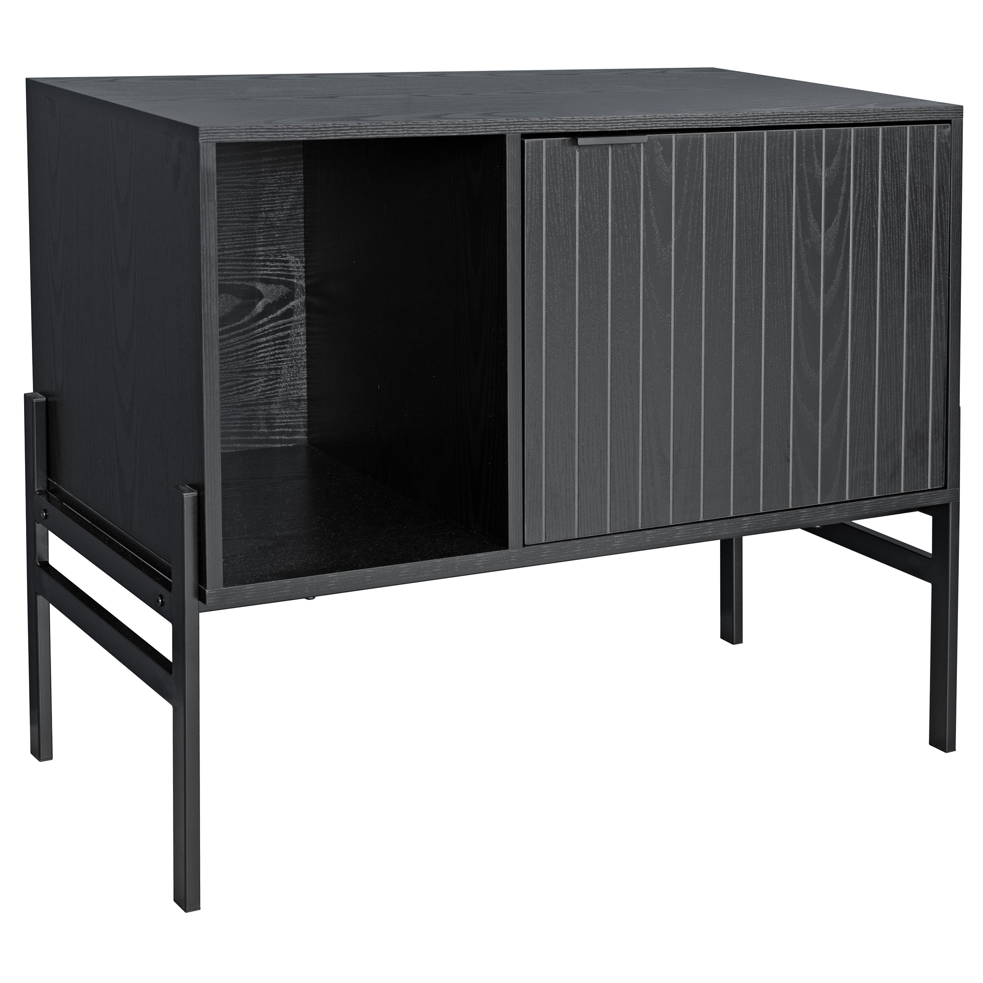 A small and simple black storage cabinet with a wood veneer finish and a striped groove design on the door.