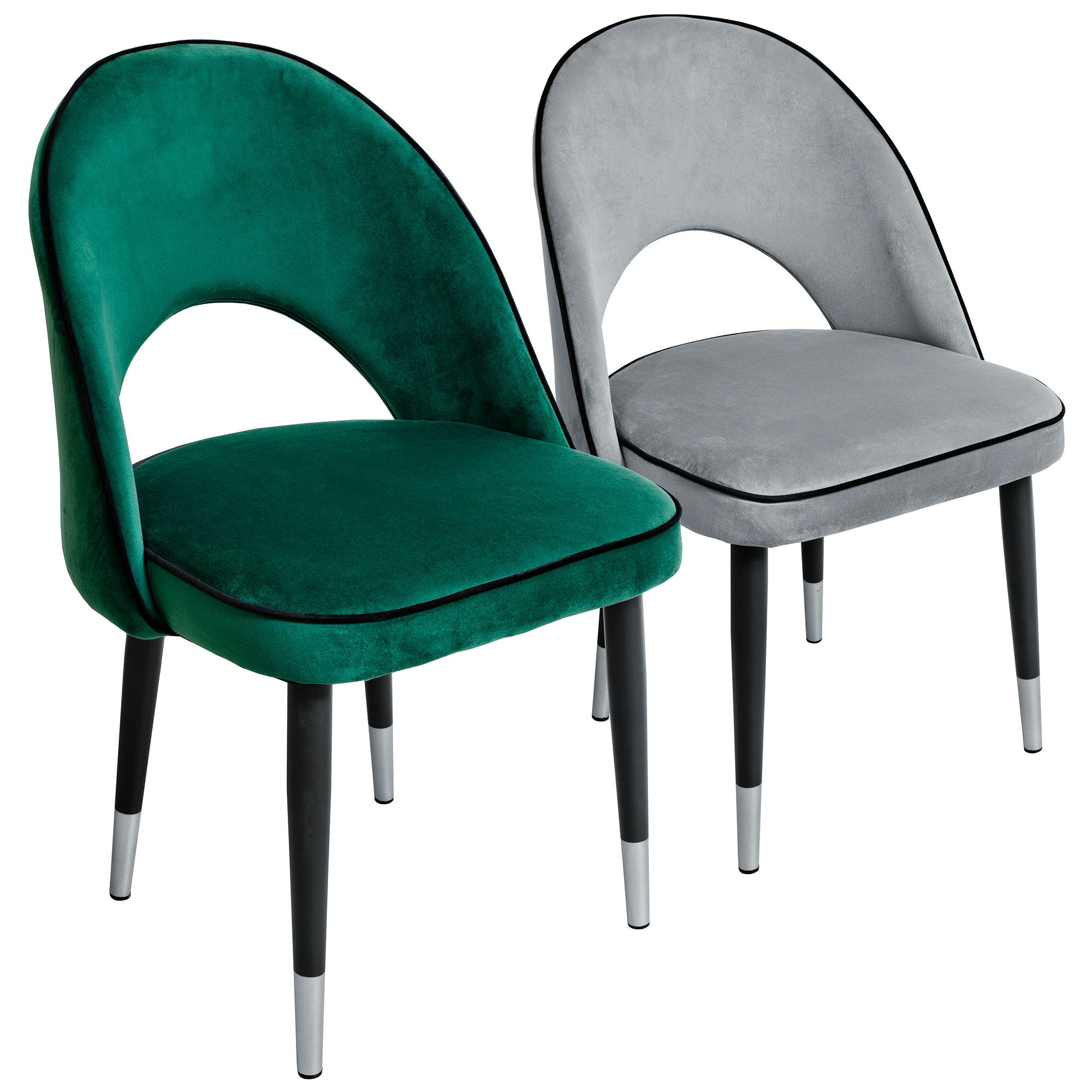 A compact, comfy curved back fabric covered dining chair with a stylish black fabric trim and matching black metal legs. Available in grey and green fabric only.
