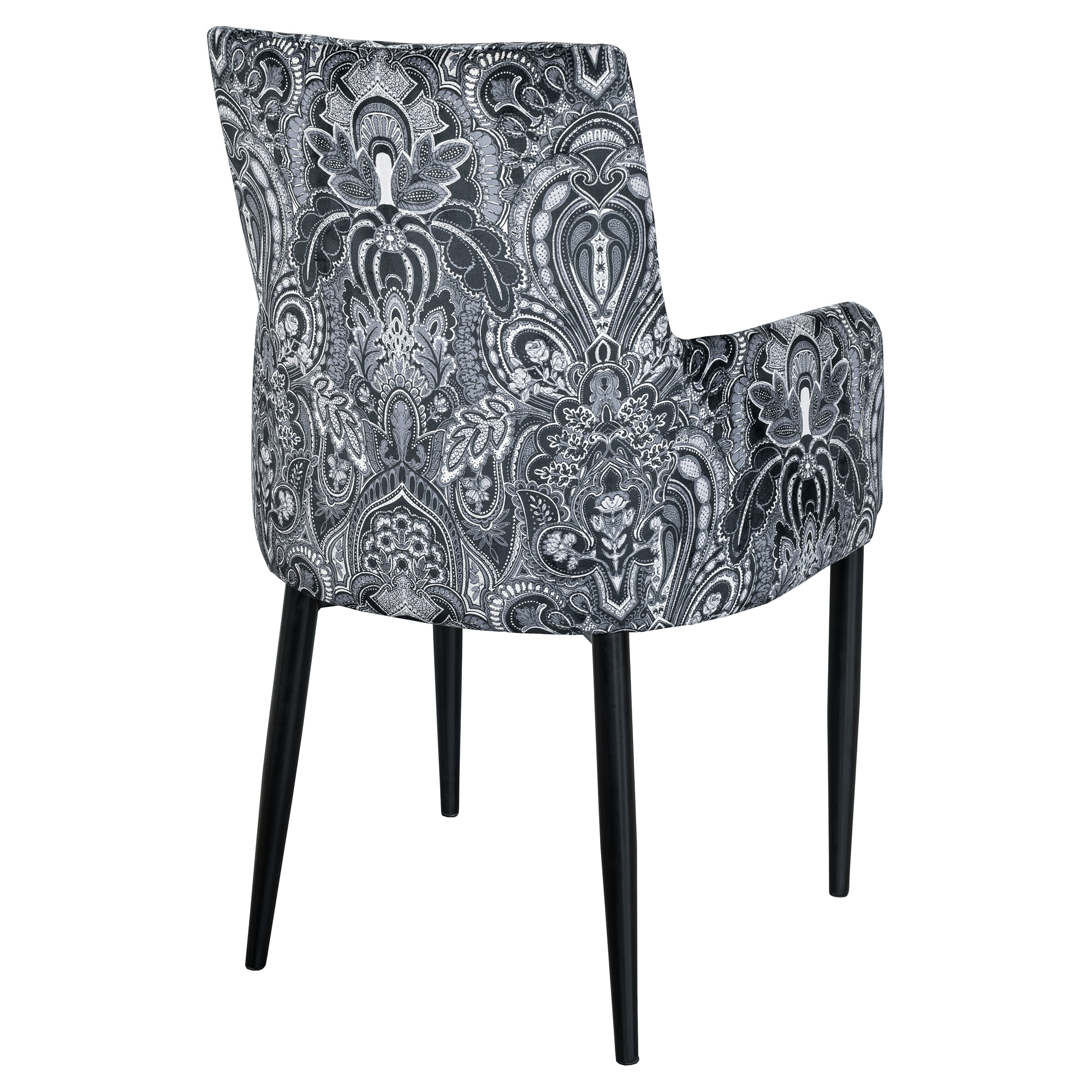 The Duncan Dining Carver is part of the Casa Nova Collection bespoke furniture range, this chair has been upholstered in Laurence Llewelyn-Bowen’s Dangerous Damask Zebra designer fabric with matte black metal legs.