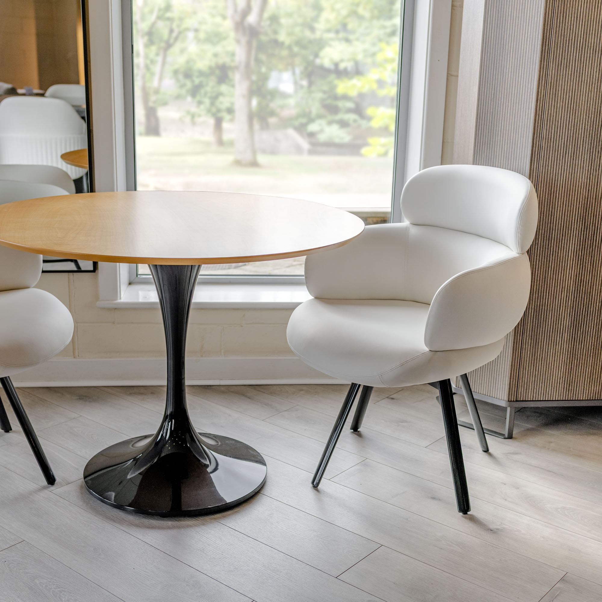 Upholstered in a smooth ivory fabric, the Aeris chair offers a light, versatile aesthetic that complements both minimalist and more layered décor schemes. Its gently curved form provides a supportive, cocooning seat, making it ideal for unwinding, reading or socialising in comfort. The plush cushioning enhances the seating experience, delivering a balance of softness and support.