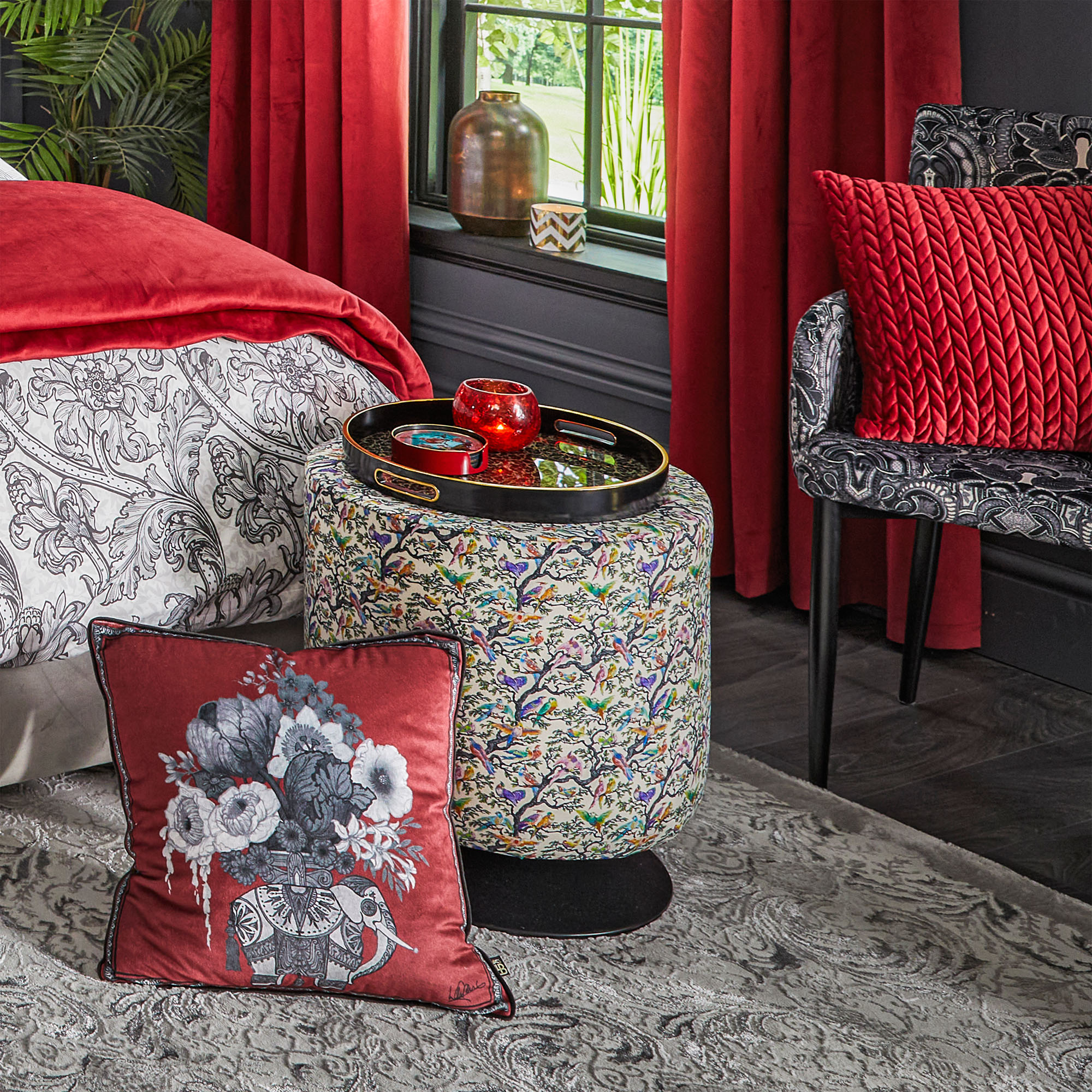 The Bespoke Swivel Drum Stool is part of the Casa Nova Collection range of furniture and home accessories, this round swivel footstool is made from a choice of Laurence Llewelyn-Bowen designer fabrics, Birdity Absurdity White.