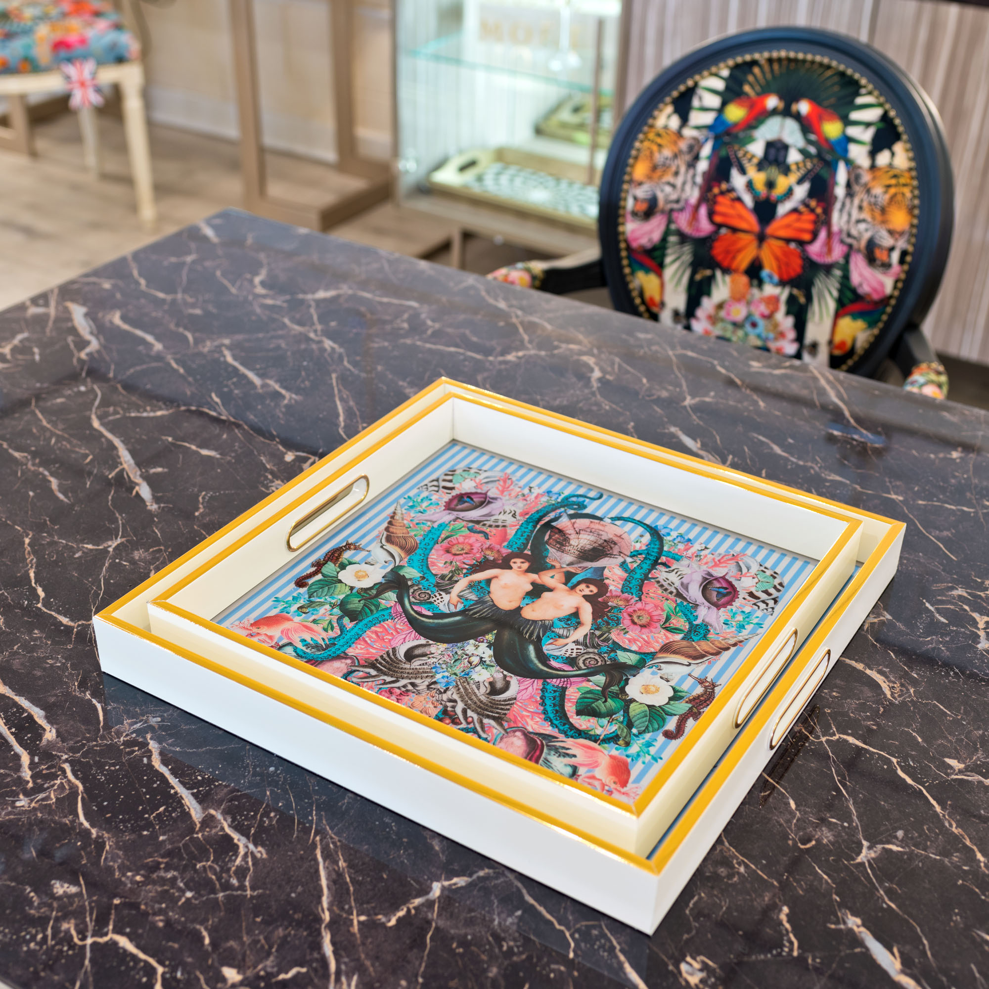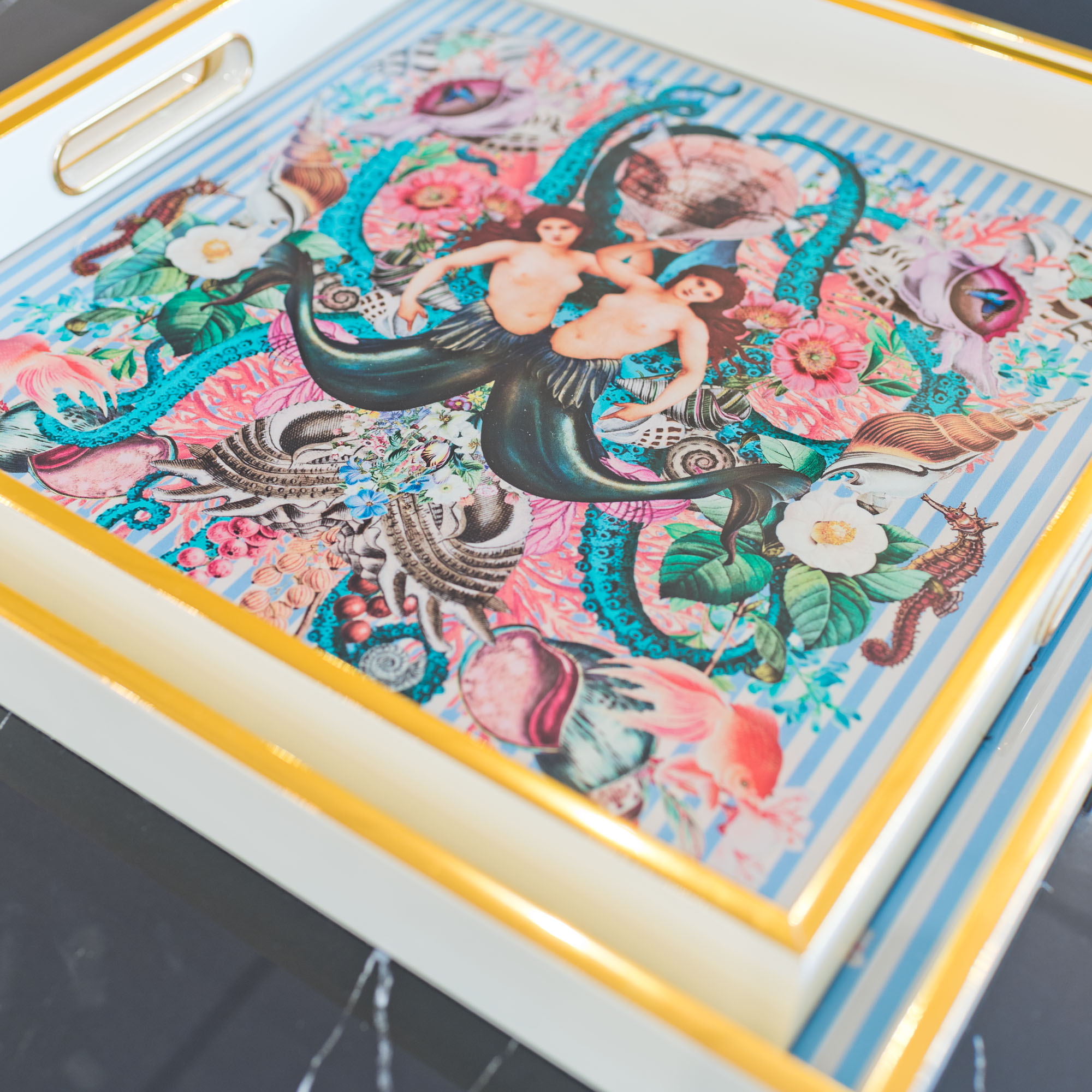 A set of 2 square white and gold serving trays with a Myrtle and Mary Sirens design, part of our Myrtle and Mary collection of trays and coasters.