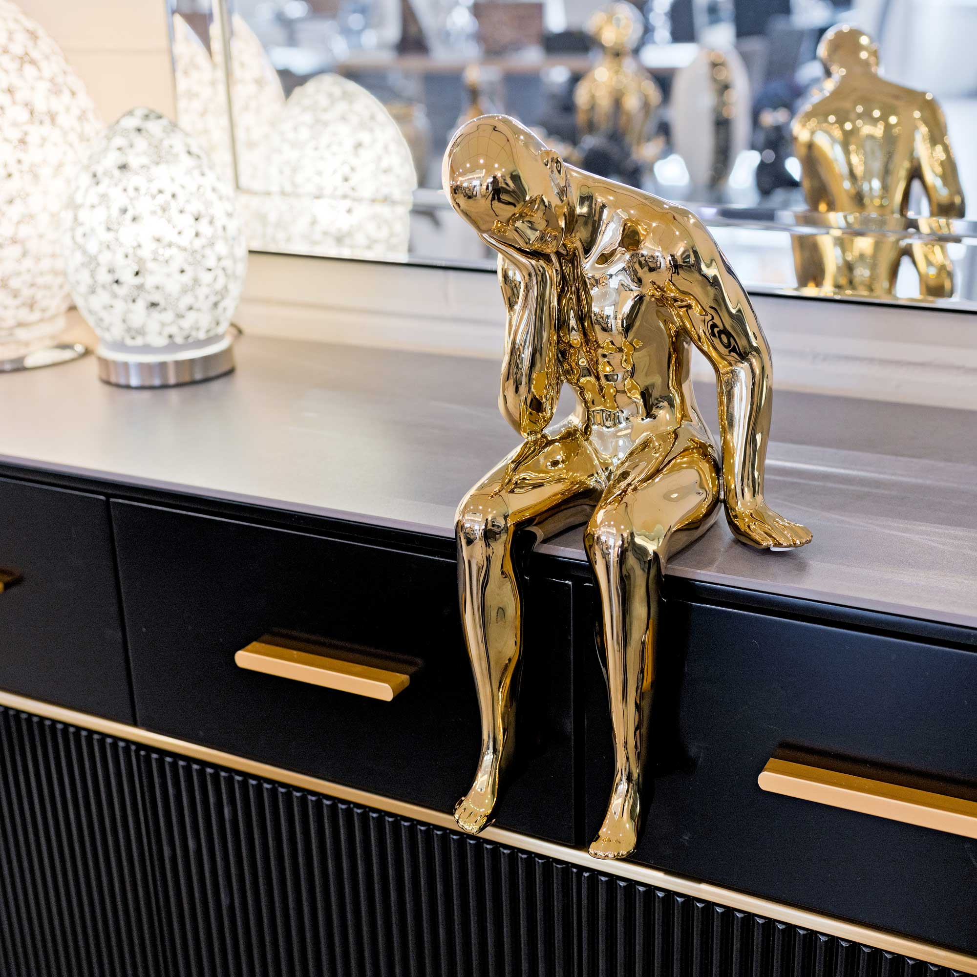 The gold thinking man is a stunning mirror finished ceramic sculpted in the form of a man deep in thought. A great piece of gold ceramic art that can sit on your mantle or window sill.