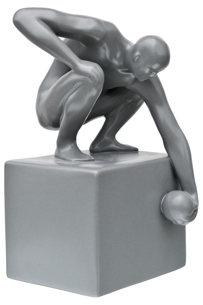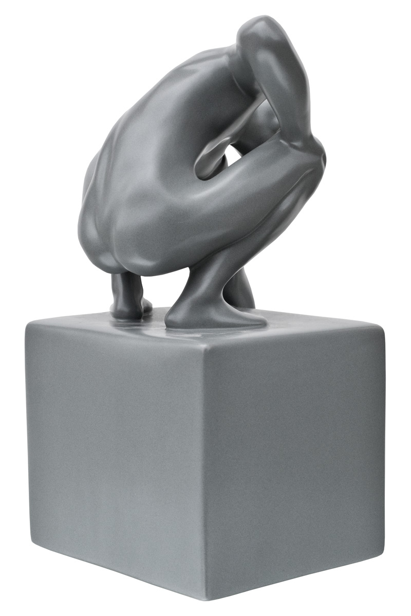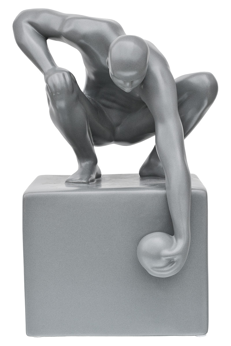 World in his Hand Ceramic Sculpture is a grey ceramic sculpture of a man holding the world in his hand atop a square pedestal.