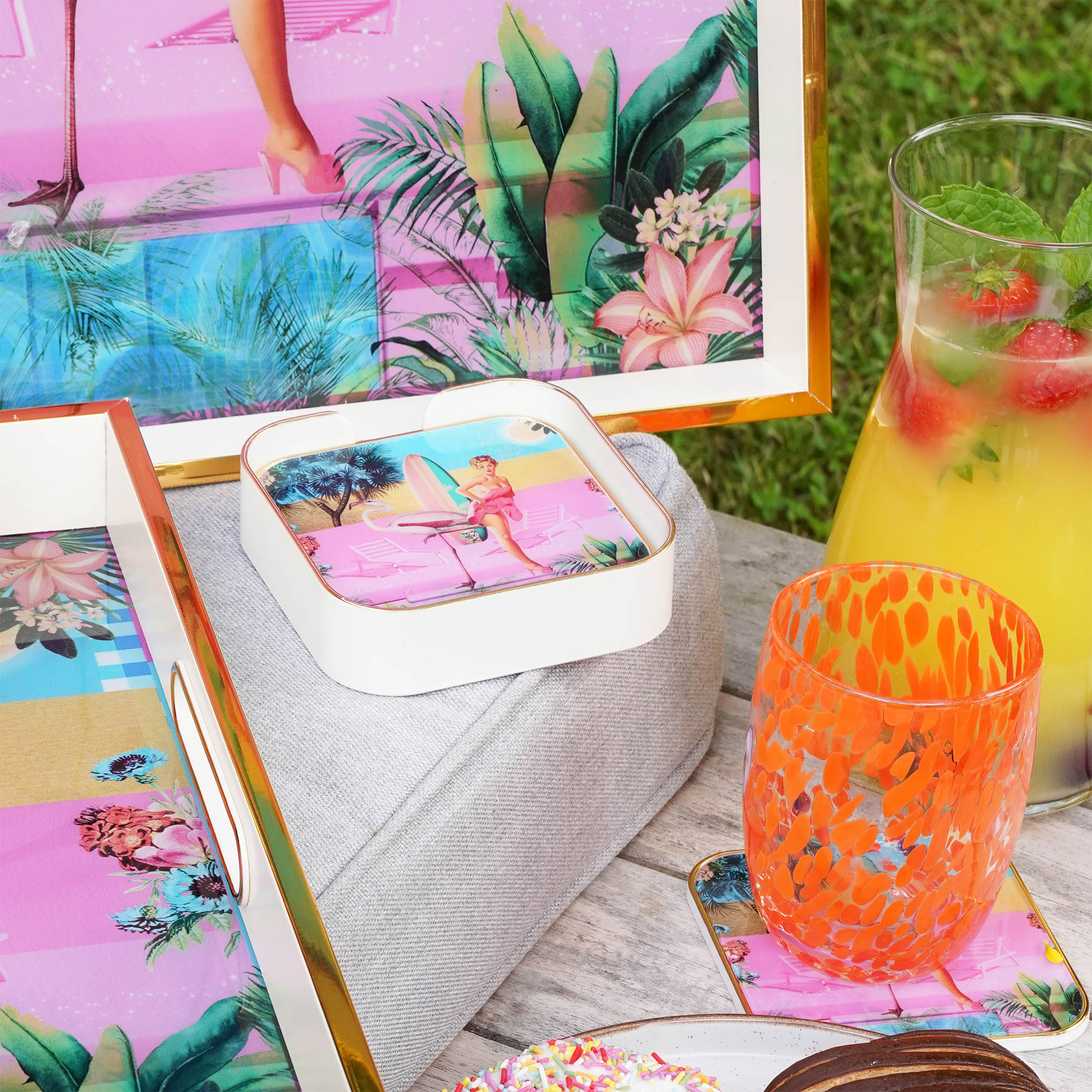 A set of 4 square white and gold coasters with a Myrtle and Mary Barbie design, part of our Myrtle and Mary collection of trays and coasters.