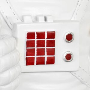 An out of this world astronaut figurine holding a microphone preparing to sing his way into your heart and onto your shelf. This charismatic character is holding a gold microphone, covered in an all white astronauts space suit with red and gold features. The visor has a reflective gold finish and can give off a stunning look in the right environment, display in the child's bedroom to inspire them to reach for the stars. Height : 19cm, Width : 13cm, Depth : 8cm- Reflective gold visor