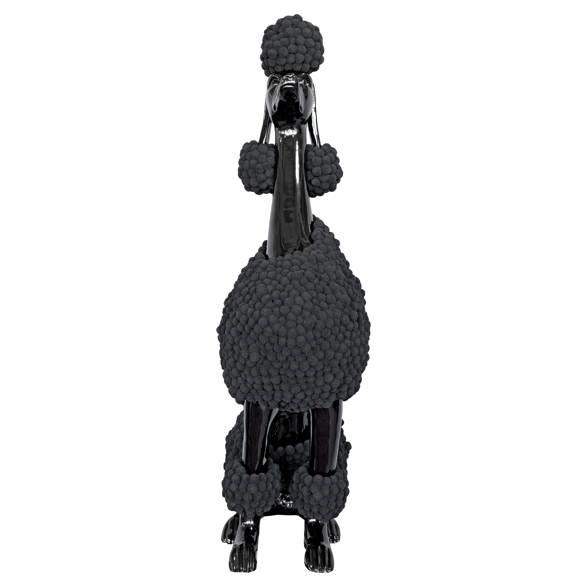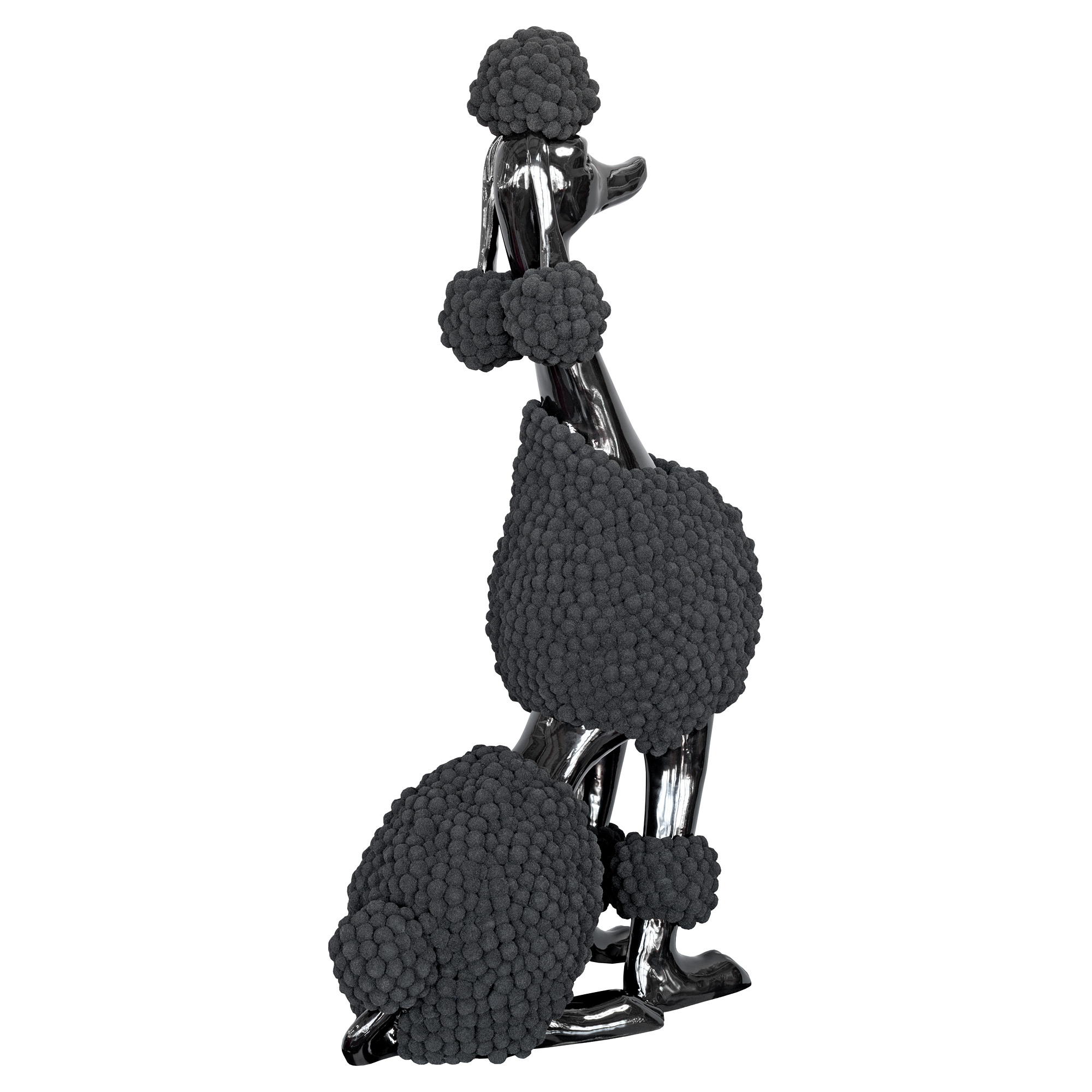A fabulous and strikingly realistic depiction of a black pompom poodle finished in a high gloss black finish and covered with black felt pompom balls, perfect for dog lovers. Elevate your home aesthetic with this one-of-a-kind statement piece that celebrates the beauty of design and the undeniable charm of man’s best friend.