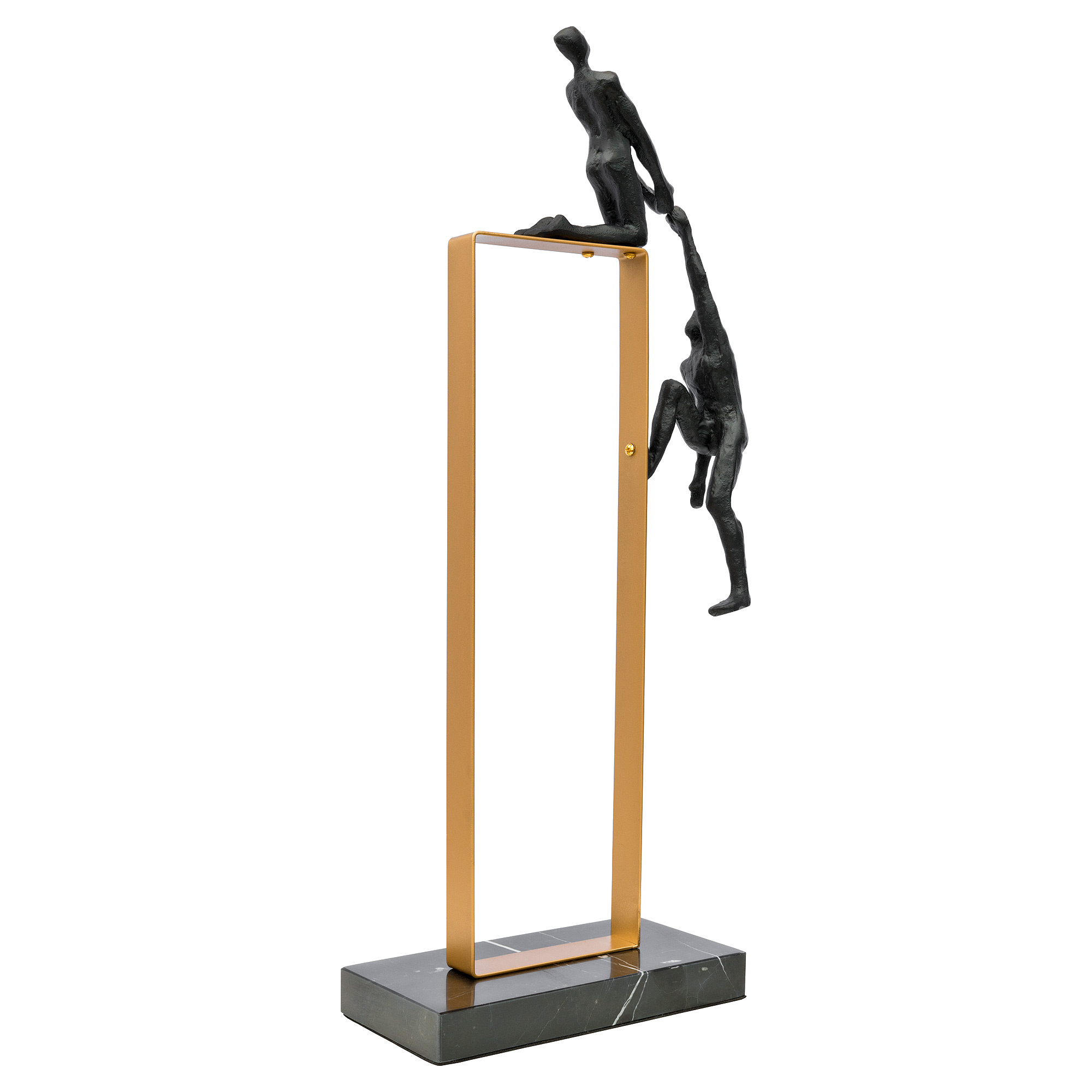 The ornament itself has a rectangular marble style stone base with the black resin figures attached to a simple brass rectangular frame.