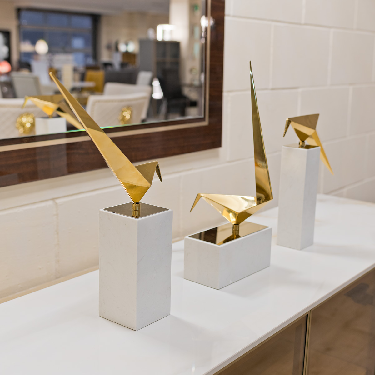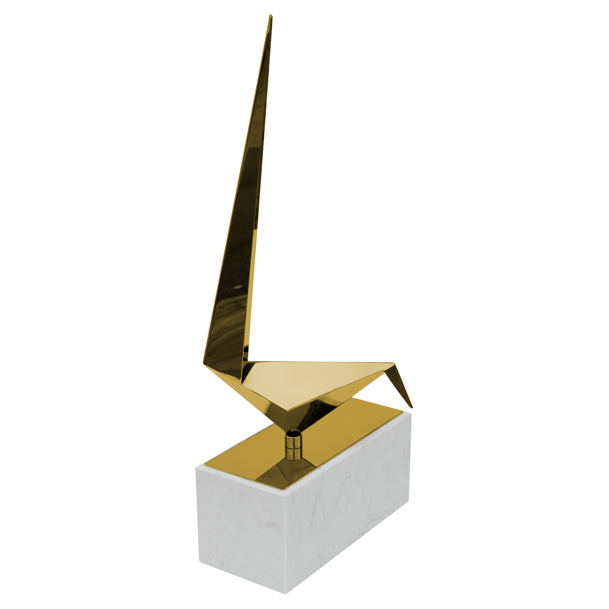 A gold long tailed tit on a marble plinth, this decorative ornament has an abstract origami design of a long tailed tit in a reflective gold finish standing atop a small rectangular marble style plinth.