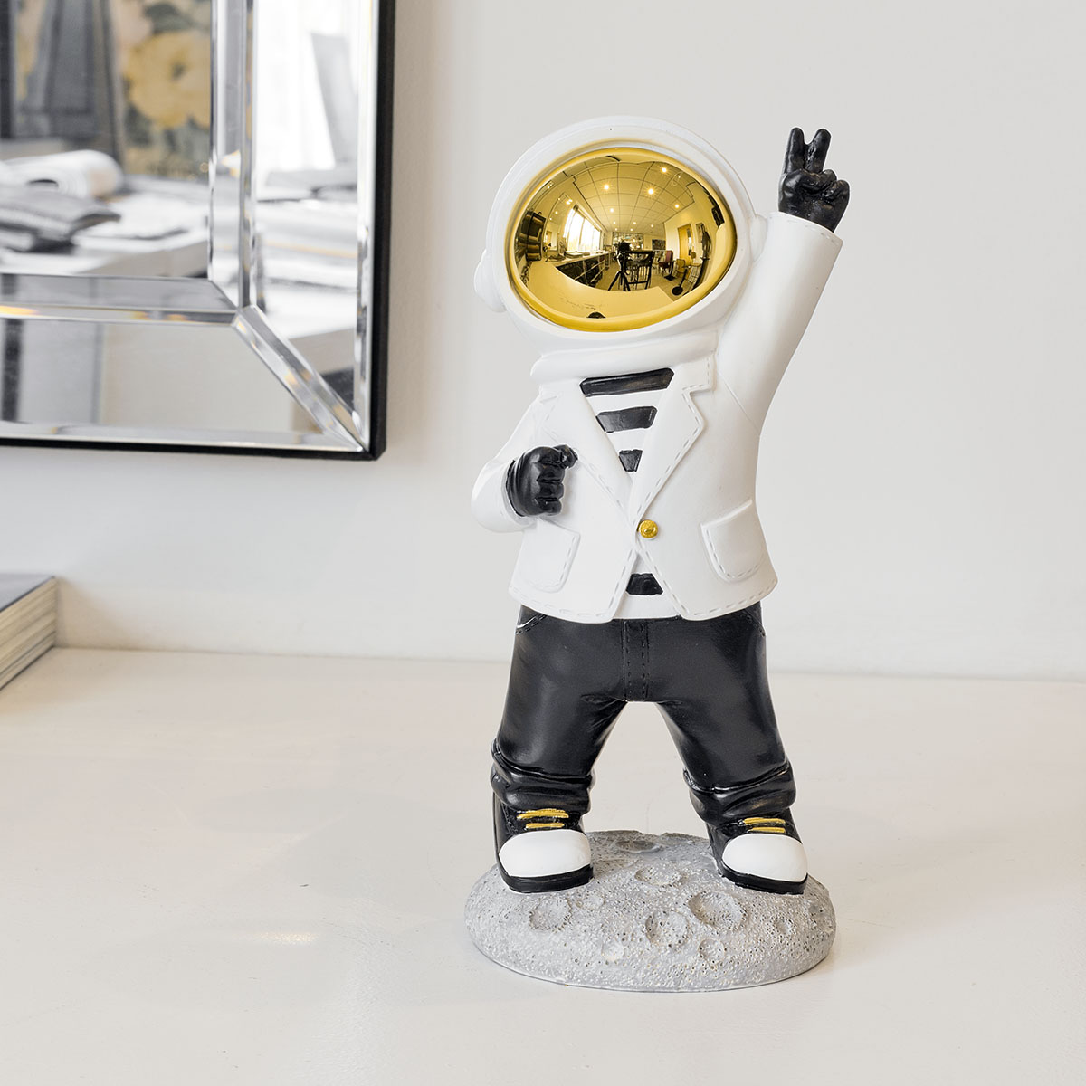 Victory Pose : The astronaut confidently raises two fingers in the iconic signal of triumph, infusing any room with a sense of playful achievement.