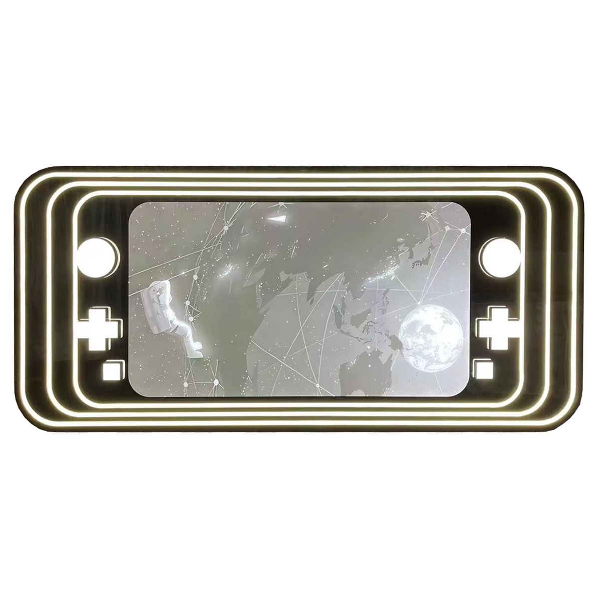 A large LED wall art picture depicting an astronaut floating through space observing the earth, the pictures border is outlined with curved bright white LED lights with some additional LED light features resembling space console controls.