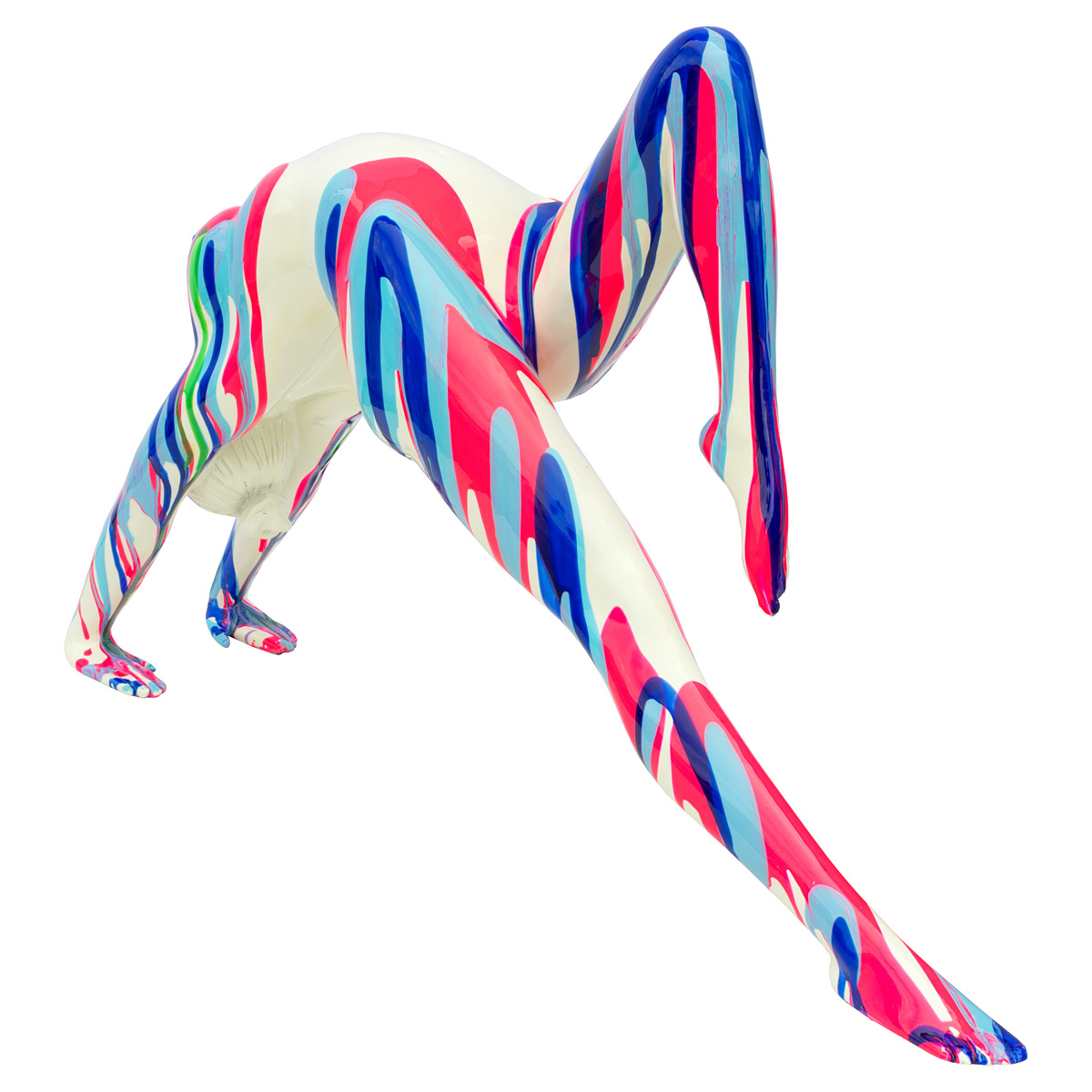A large rose pink, blue, green and white striped resin statue of an attractive lady posing in a yoga or stretching exercise pose.