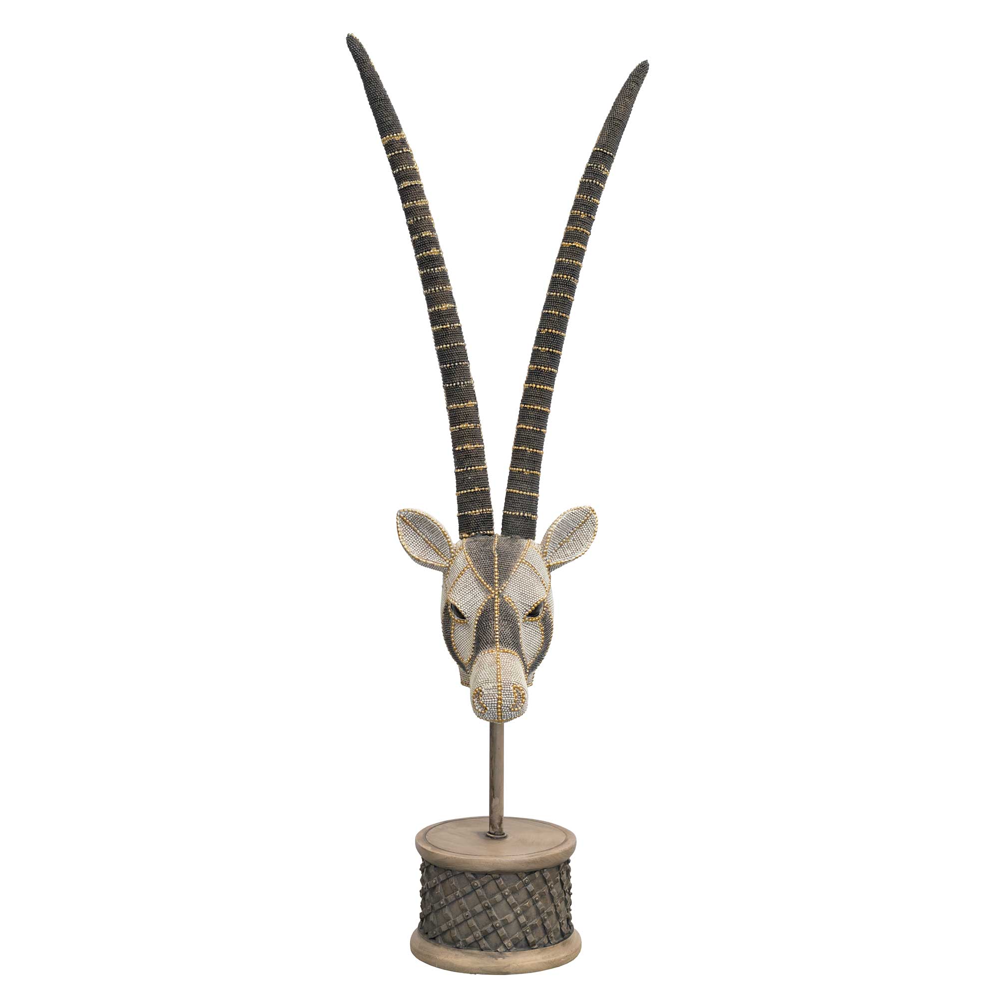The statue has many gold beaded features and patterns all across the design and really stands out with its large prominent horns.