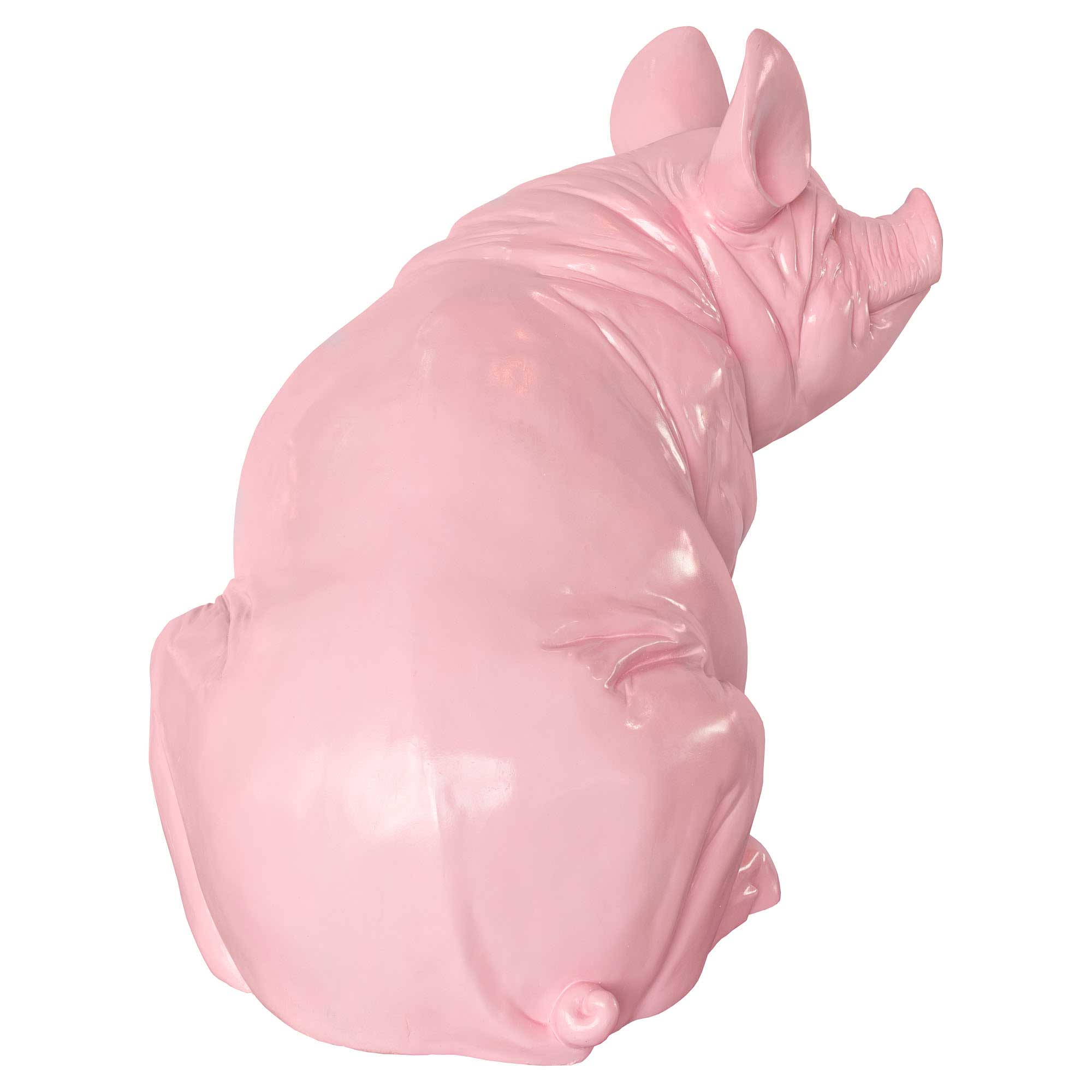 A big and heavy life-like pig statue made from poly resin with a bright pink finish.