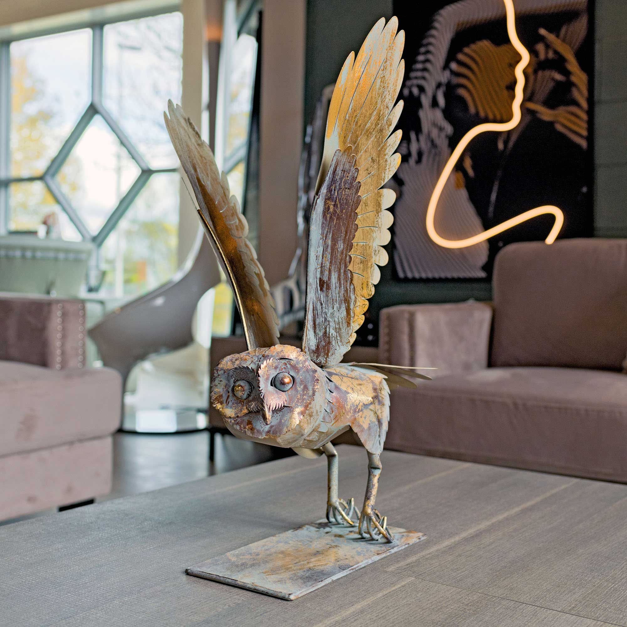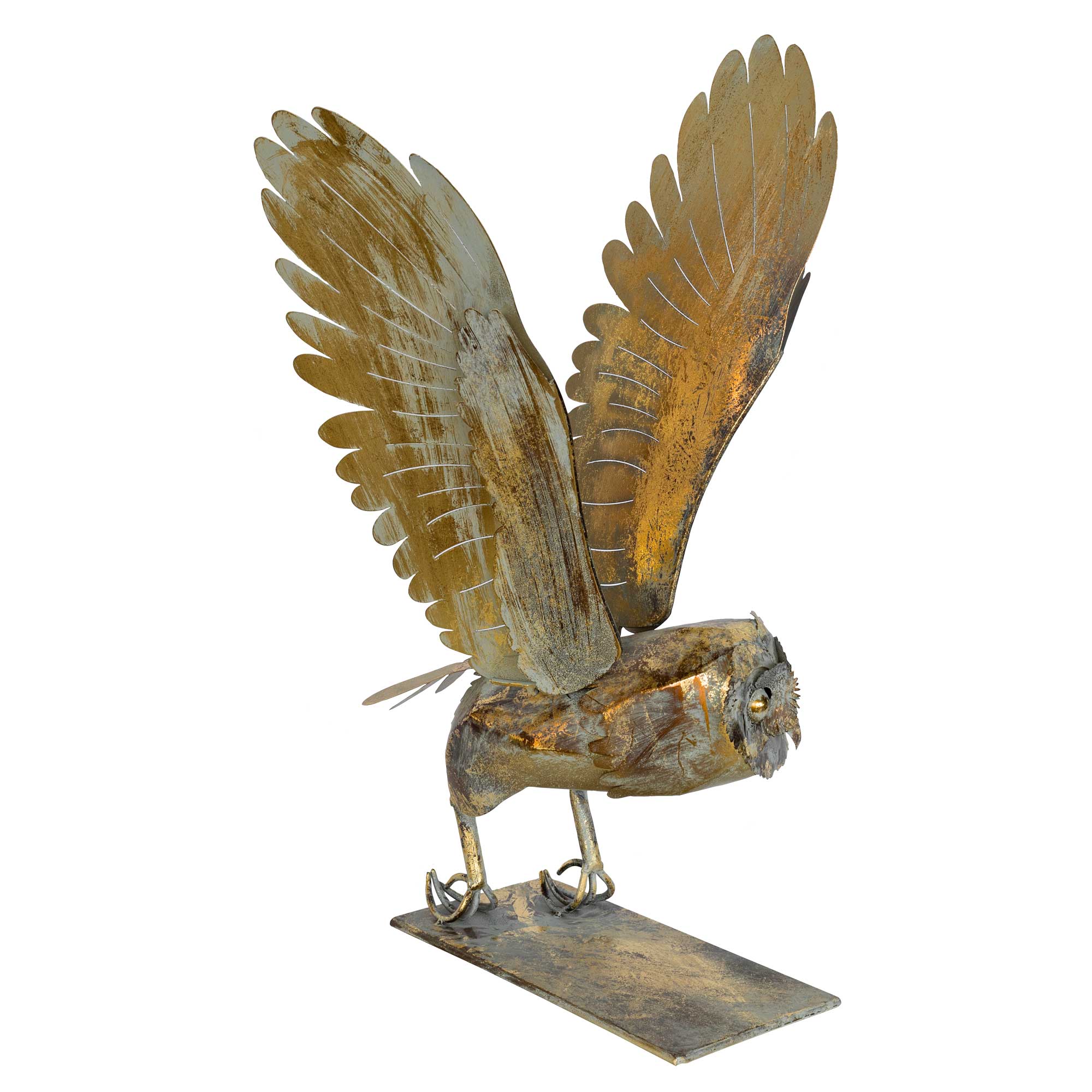The gold owl sculpture, a handmade metal owl statue with its wings spread in flight. This fabulous piece of art is made from iron with a weathered gold finish mounted on a rectangular base, the perfect centerpiece for any home decor.