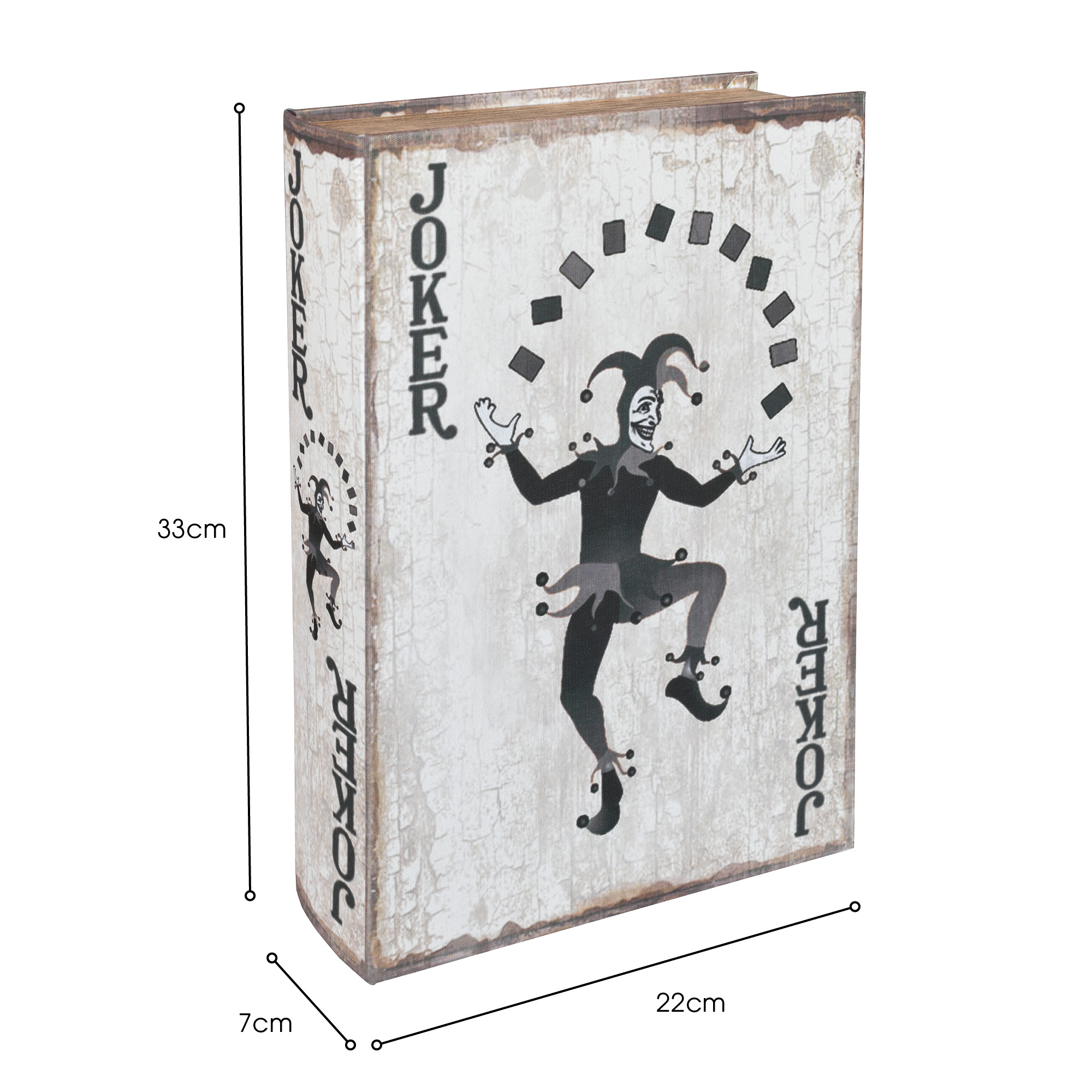 Styled to mimic the look of an old, well-loved hardcover book, this box features a striking black and white design inspired by classic playing card motifs. The bold illustration of a lively joker on the front cover brings a sense of fun and unpredictability, perfect for those who appreciate playful, eclectic, or themed aesthetics.