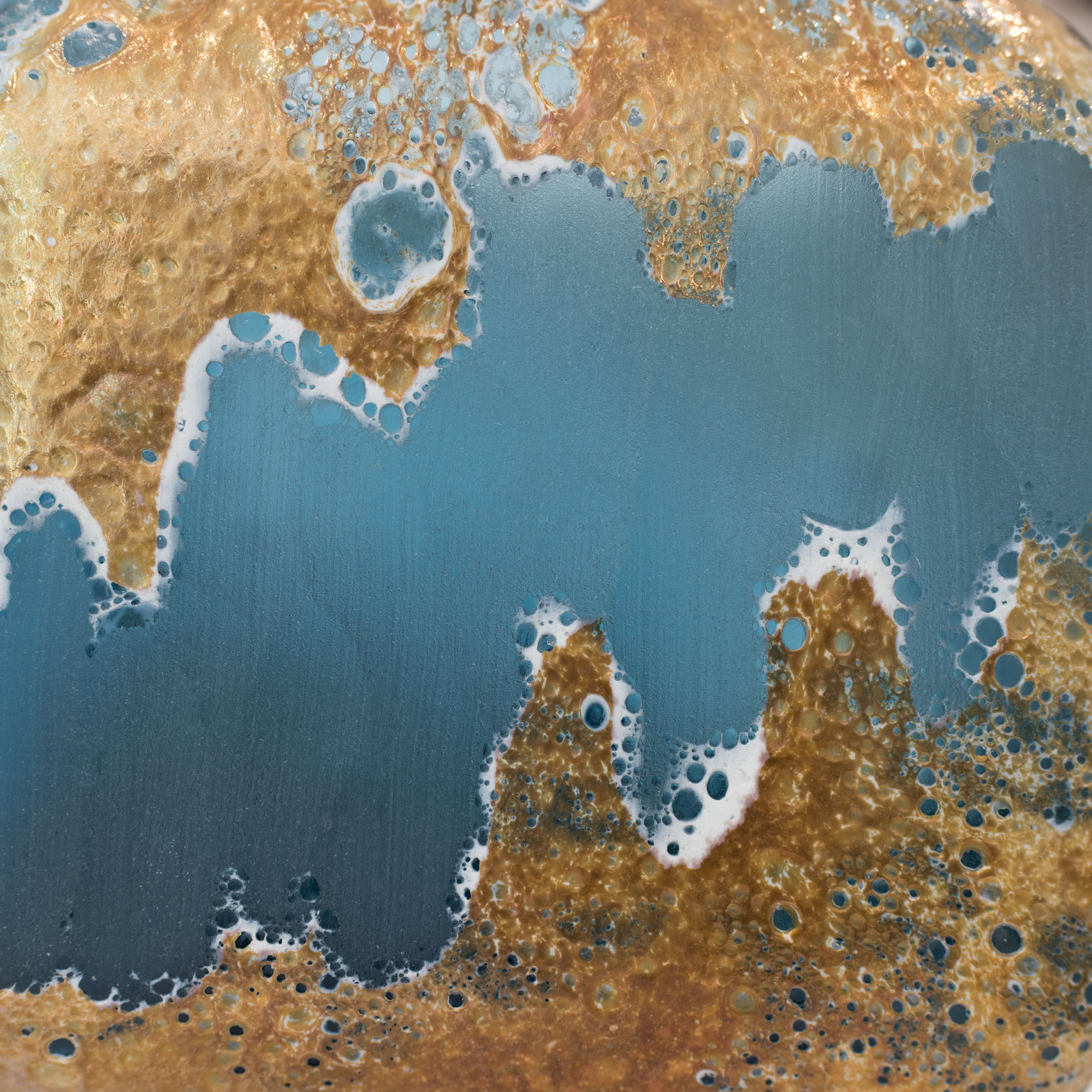 A fabulous blue and gold rounded cube glass planter, this stunning planter vase has a volcanic lava relic look with molten gold features and looks great as a set partnered up with its matching tall rectangular planter.