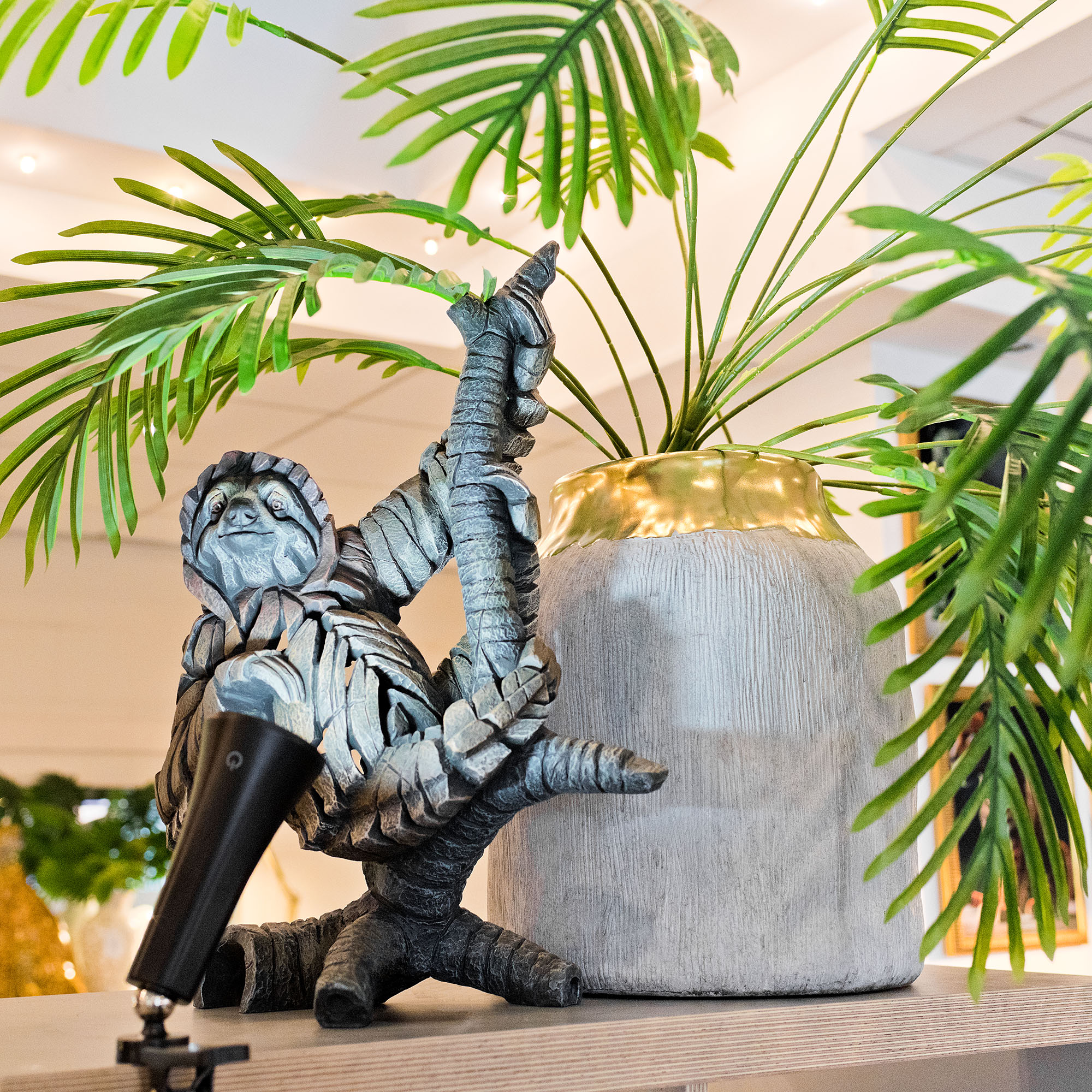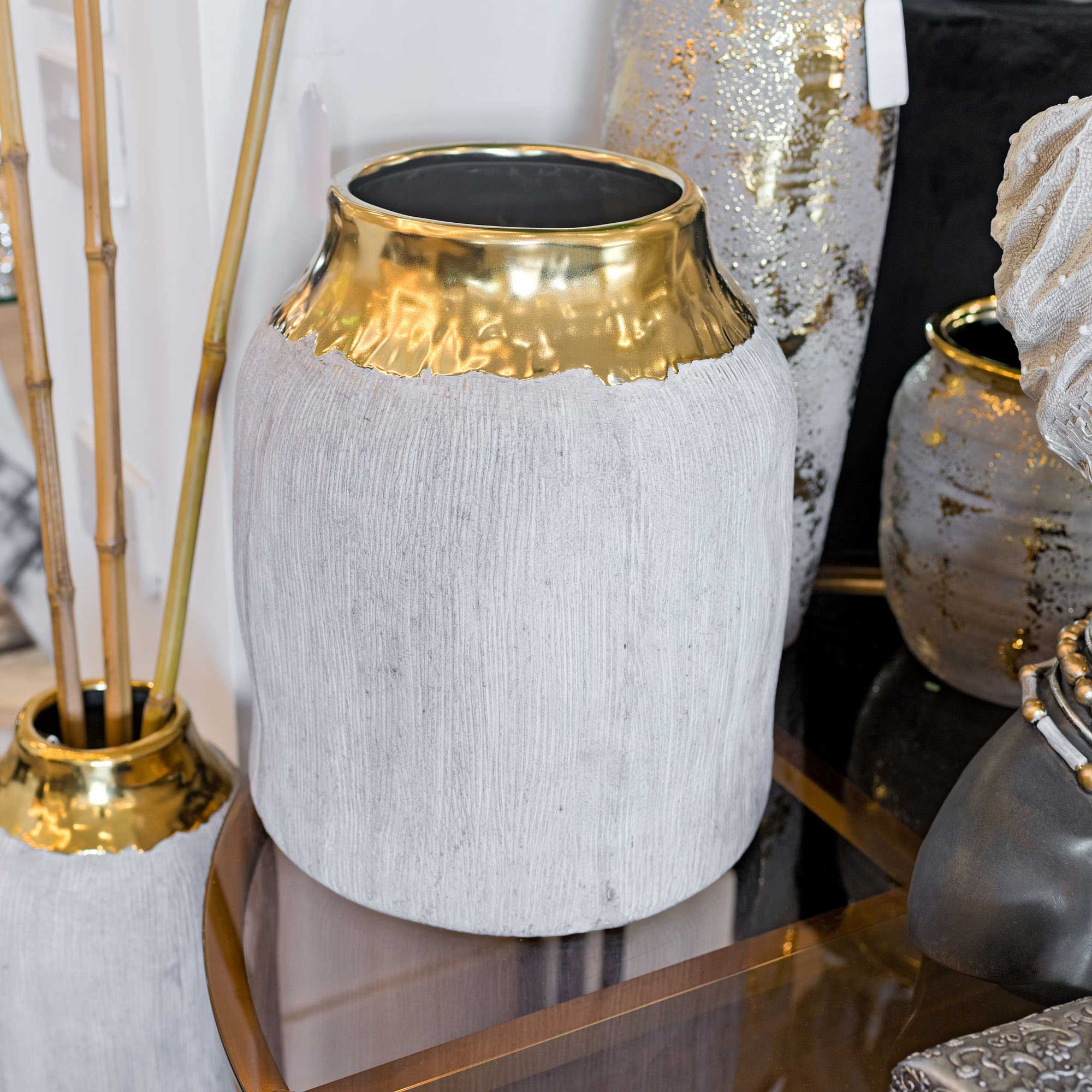 The Volkano Small Pot is a fabulous grey ceramic pot covered in a grey textured finish with a putty grey interior and has a melted gold style top that really makes it stand out with its shiny reflective surface.