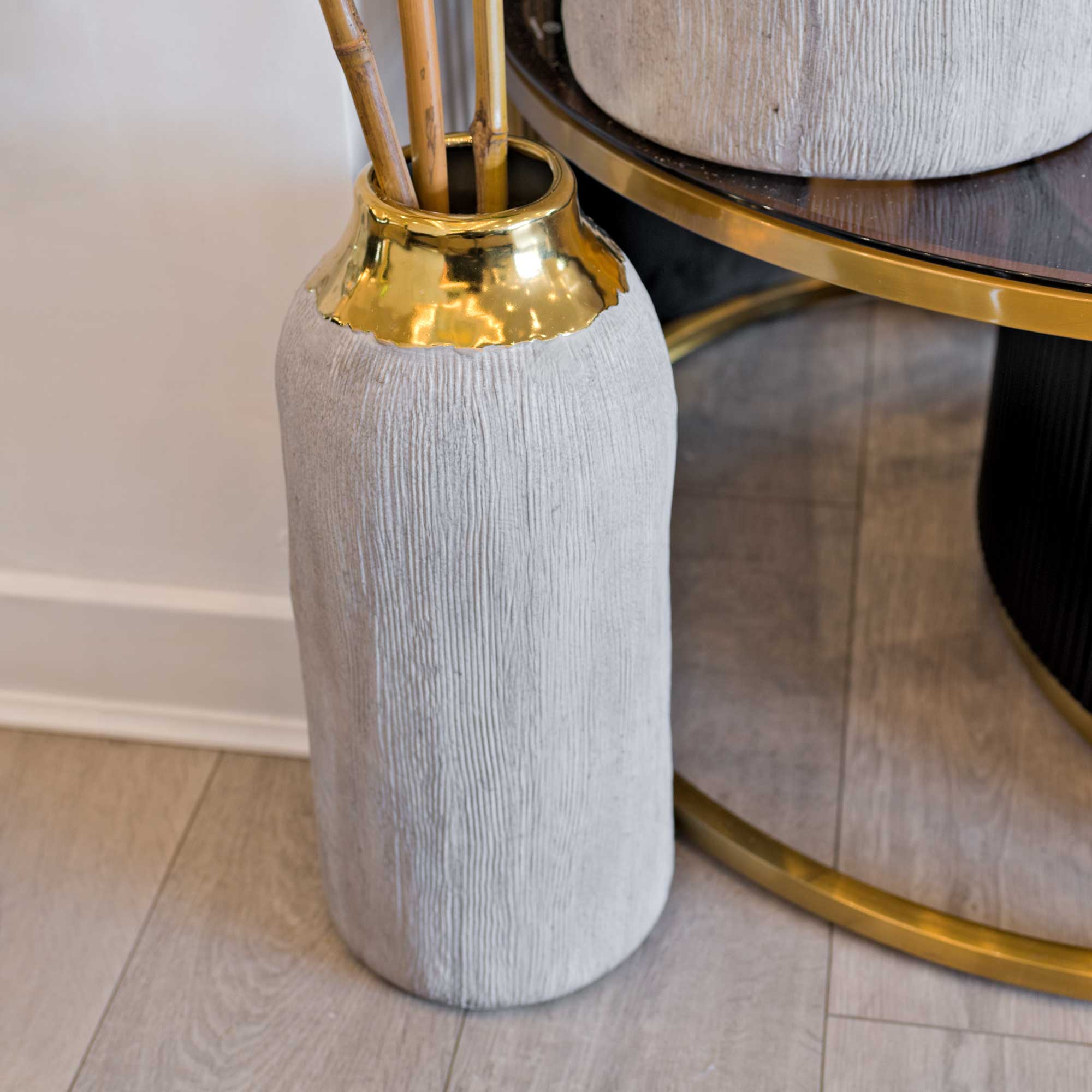 The Volkano Tall Pot is a fabulous grey ceramic pot covered in a grey textured finish with a putty grey interior and has a melted gold style top that really makes it stand out with its shiny reflective surface.