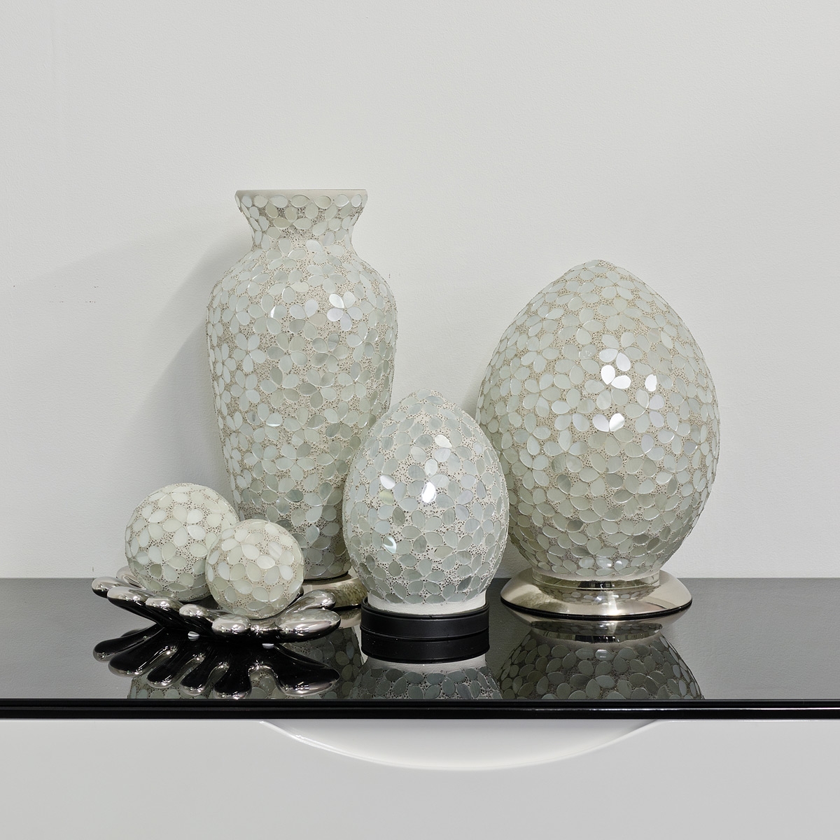 Brighten your space with the Mosaic Glass Vase Lamp in a Opaque White Flower design. A stunning decorative accent that fuses artisan craftsmanship with warm ambient lighting. Standing at 38 cm tall with a 20 cm diameter. This vase-shaped lamp features white and silver floral mosaics on hand‑blown glass. Each rich tile fragment shimmering in its own hue.