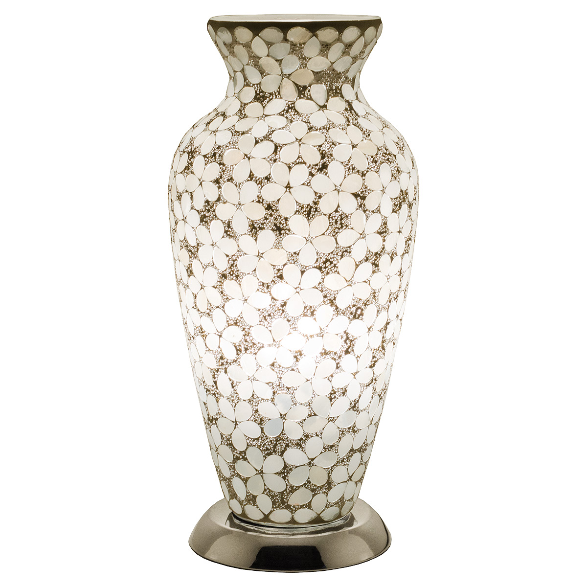 The Mosaic Glass Vase Lamp in Opaque White Flower design is a beautiful piece of lighting that lightens up the room and the occasion with its unique sense of style from the first glance.