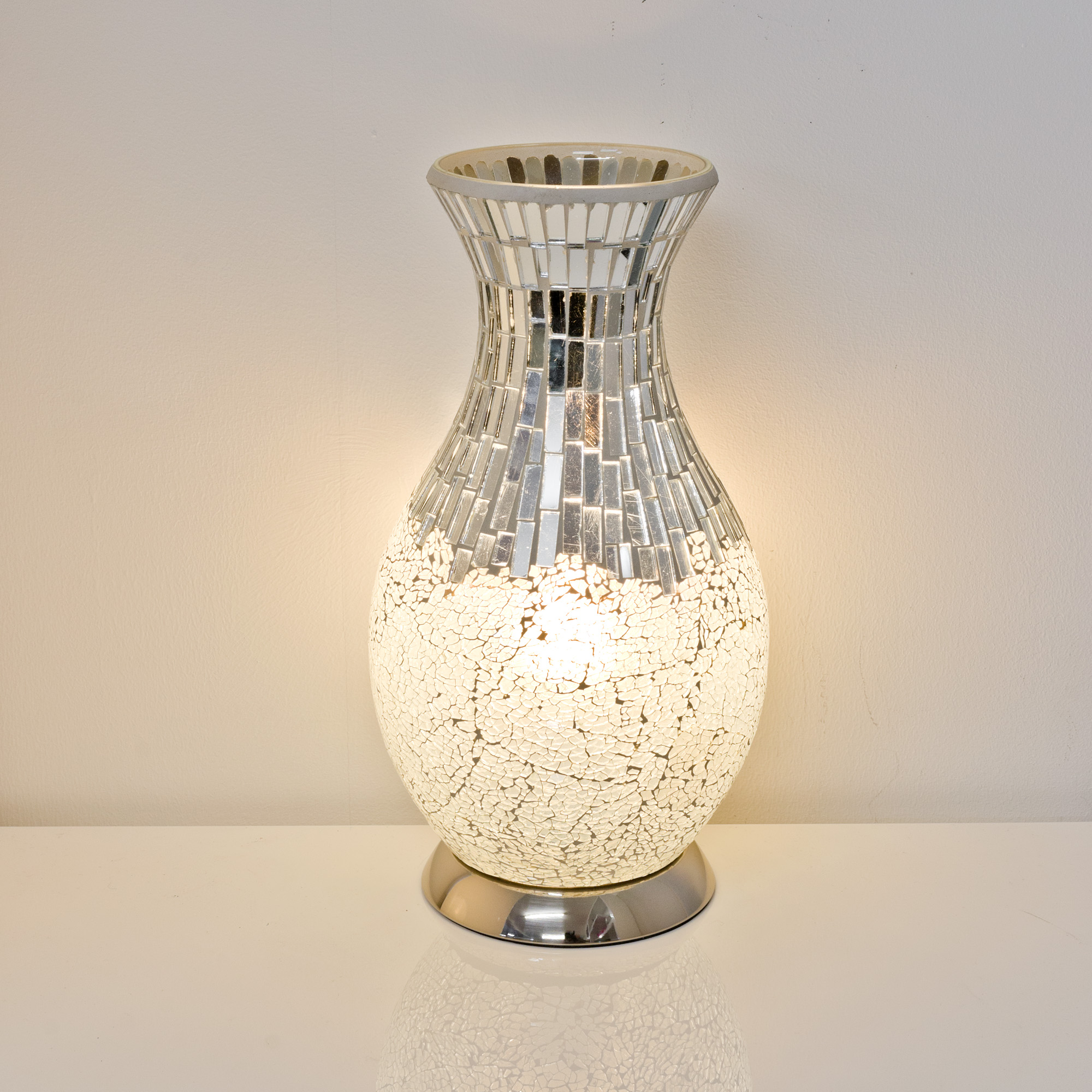 The Mosaic Glass Vase Lamp in White transforms everyday lighting into an enchanting visual experience. Standing at 35 cm tall with a 20 cm diameter, this elegant lamp features an artful vase shape rendered in sleek white mosaic glass atop a polished chrome base, making it equally striking switched on or off.