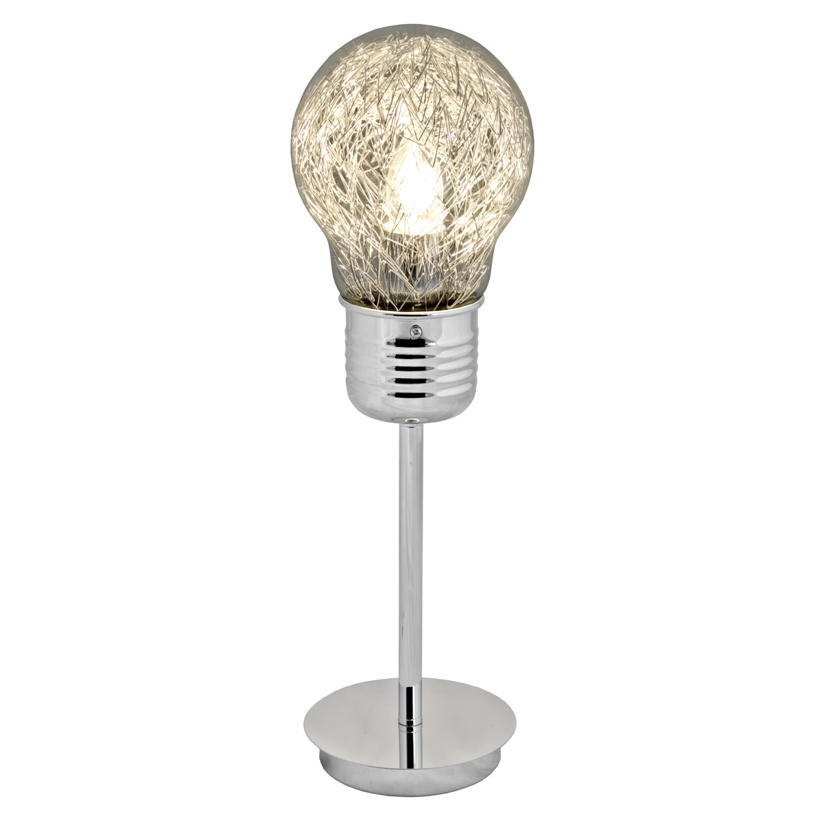 A light bulb shaped table lamp, this novelty table lamp is designed to resemble a giant light bulb filled with metal wires on a chrome base to give a unique look to any modern environment.