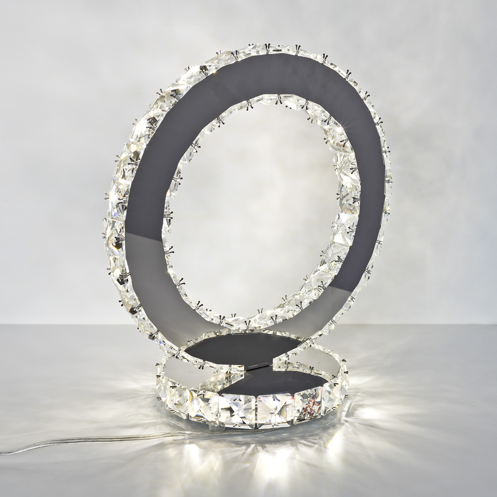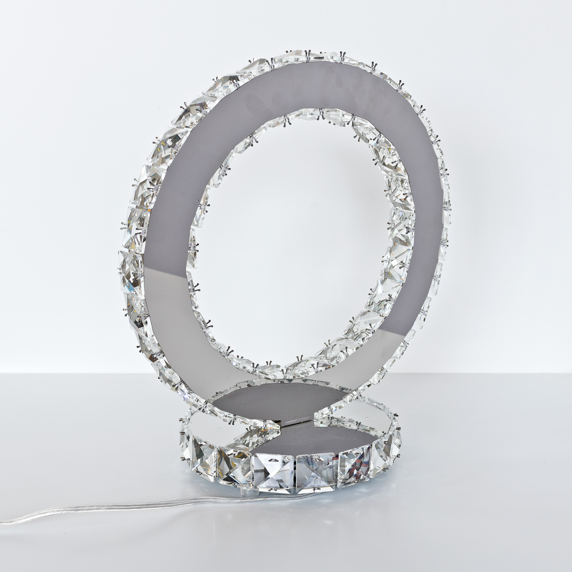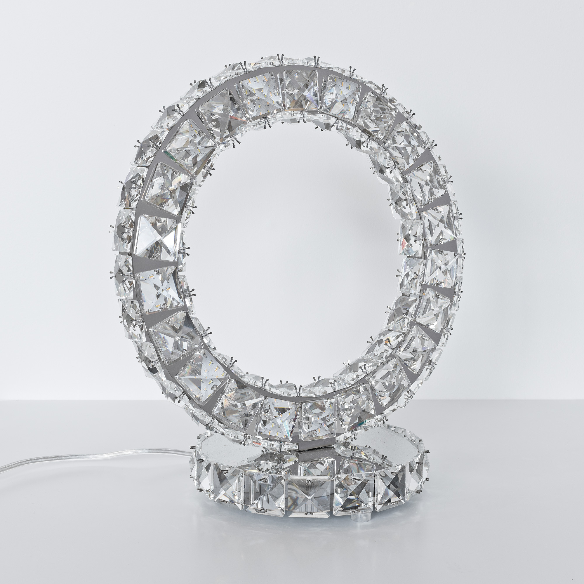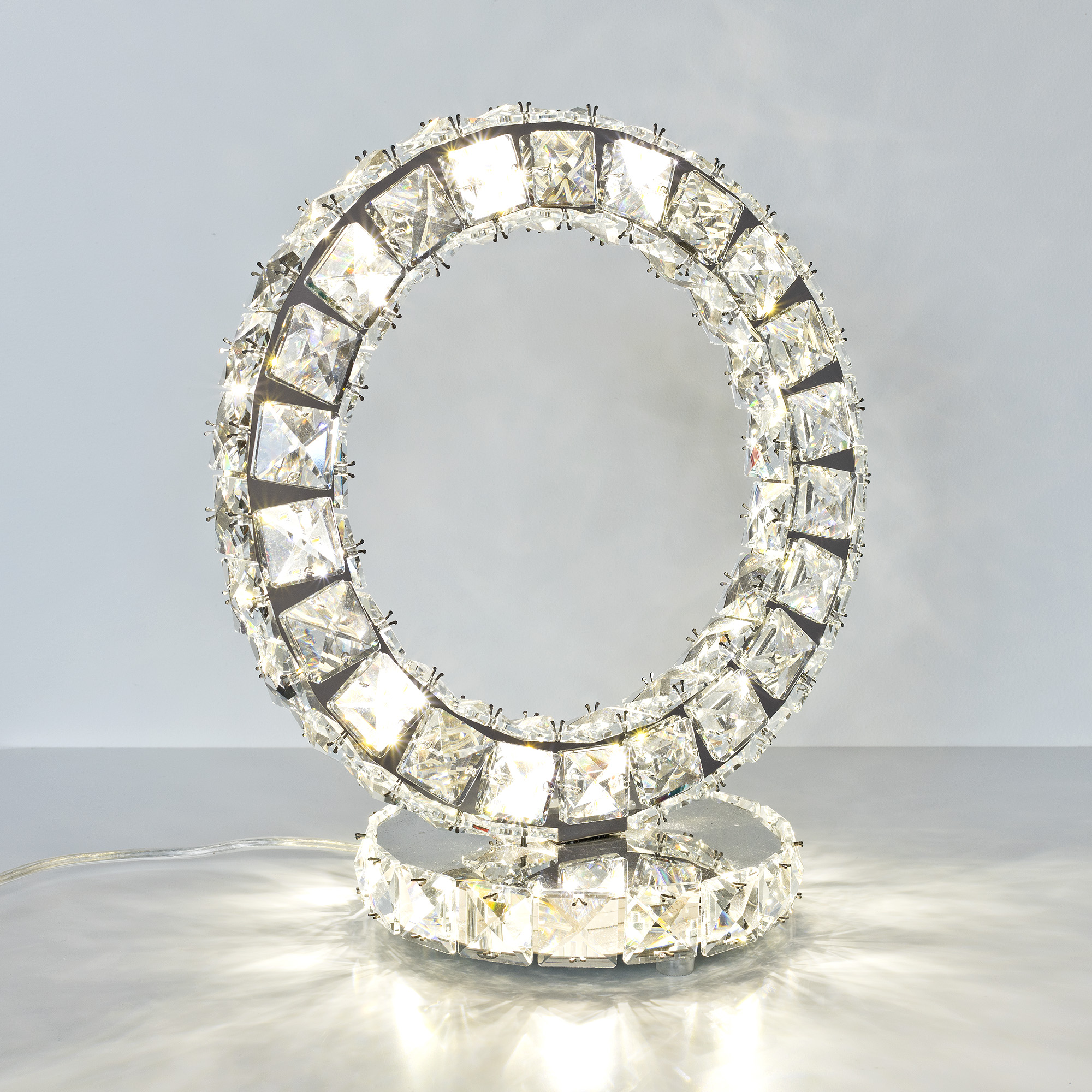 A luxurious ring shaped table light that gives off a powerful pressence with its glass crystal and mirrored design.