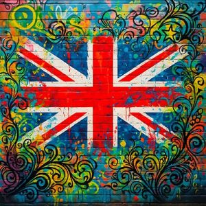 Five french velvet fabric covered skateboard deck in the "Union Jack Graffiti" design. Height : 80cm, Width : 21cm, Depth : 5cm- Velvet fabric