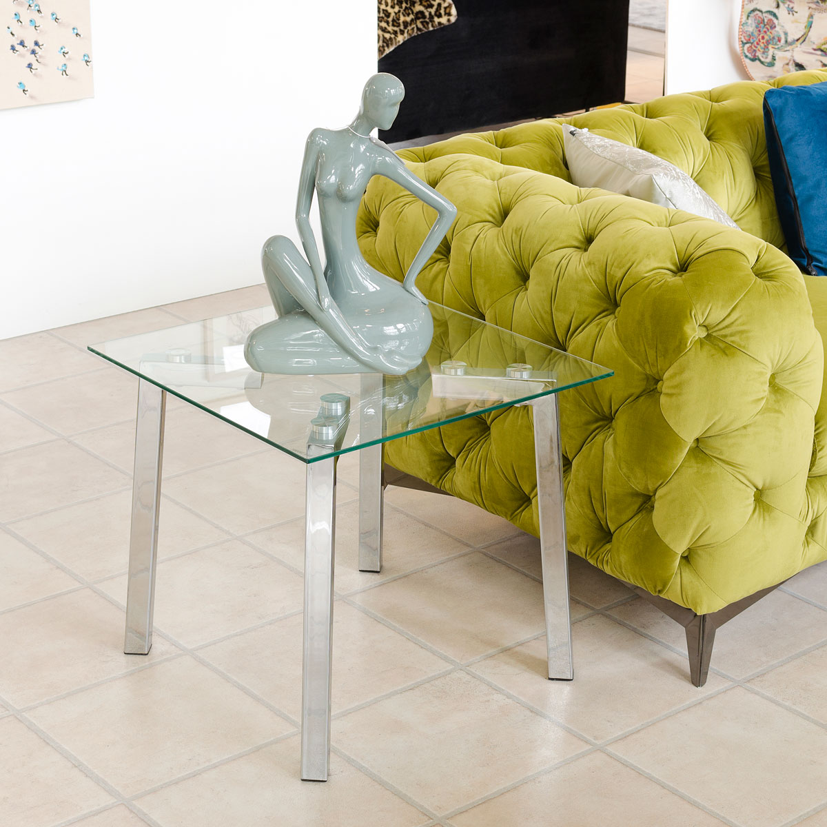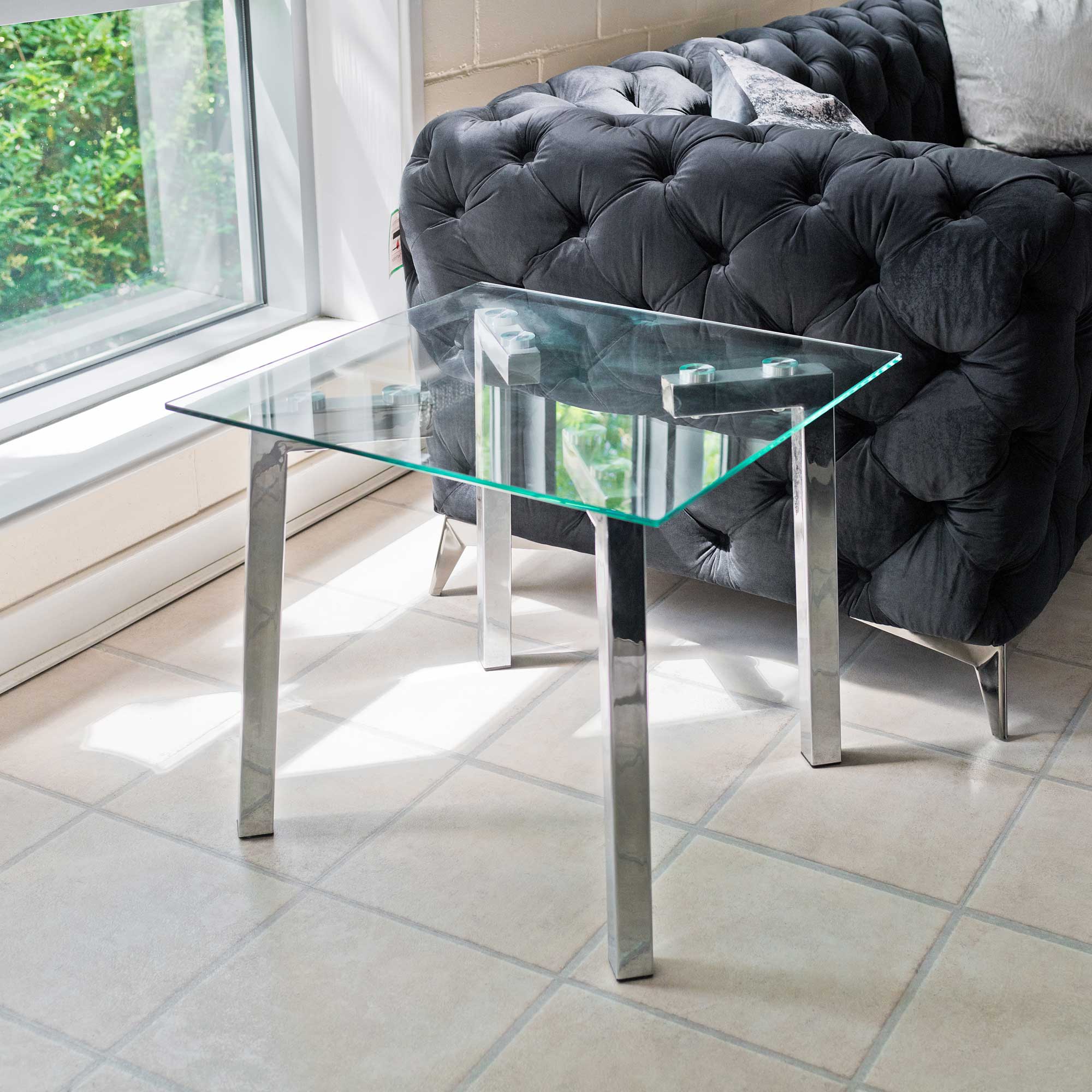 a simple but modern square clear glass lamp table supported by four metal legs.