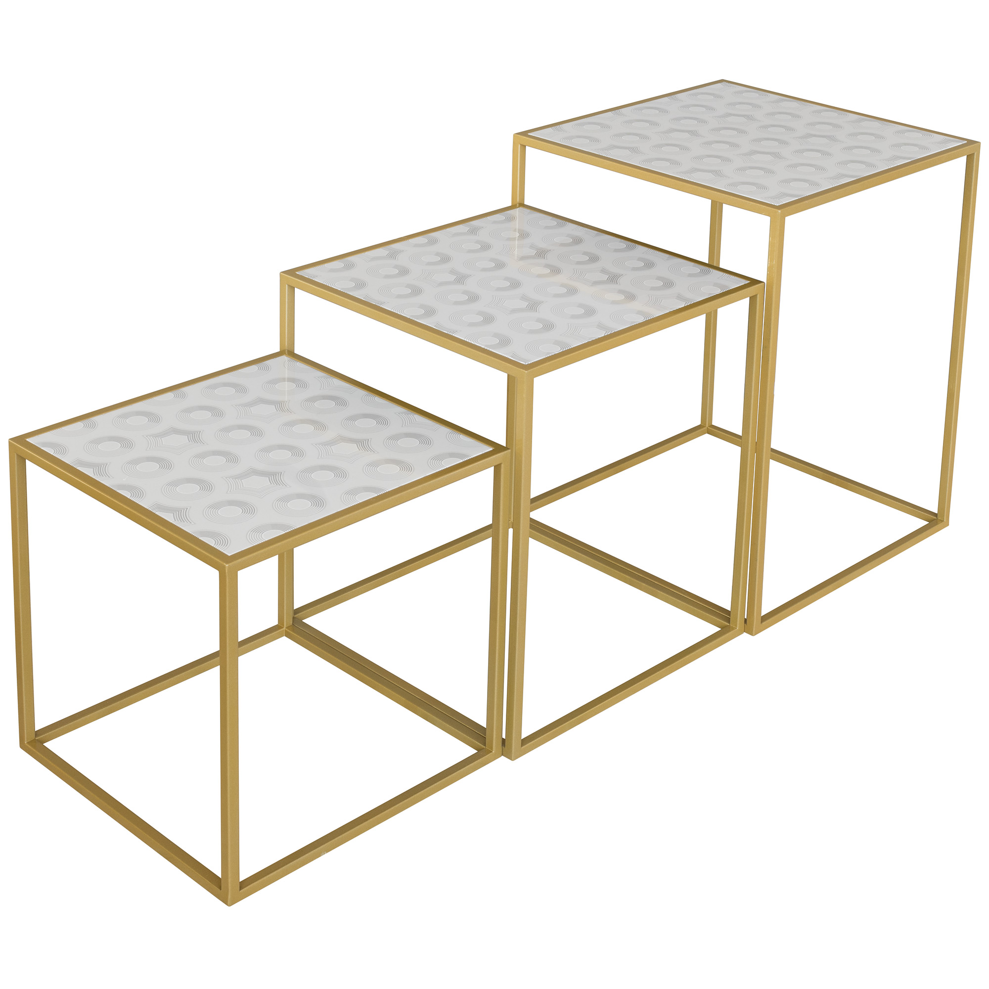 A simple and stylish nest of three tables, part of the Casa Nova Collection furniture range, this table set has an acrylic top with Laurence Llewelyn-Bowen’s Pantheon design and a matte gold frame.