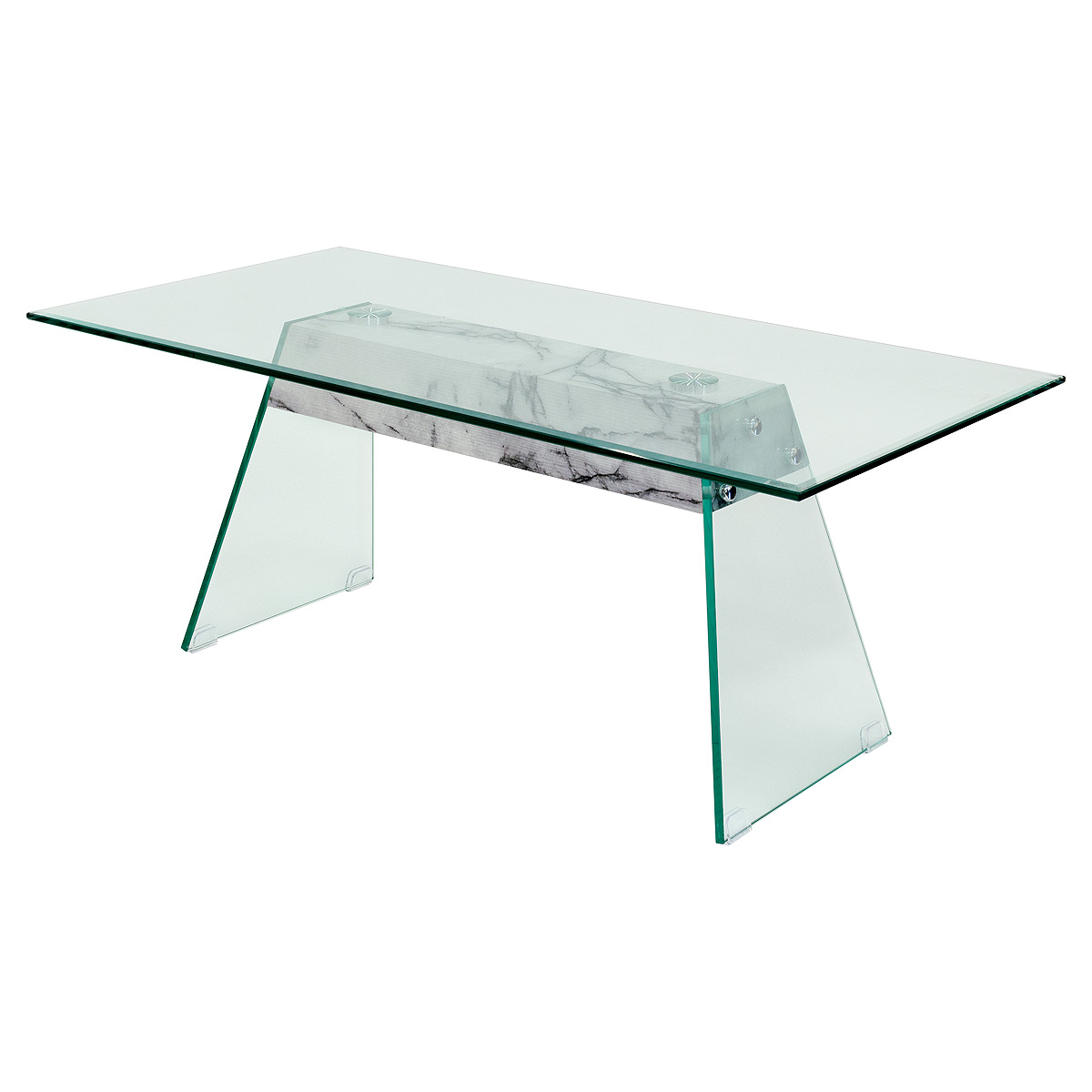 A modern and stylish clear glass coffee table made from rectangular tempered glass panels with a marble effect support.