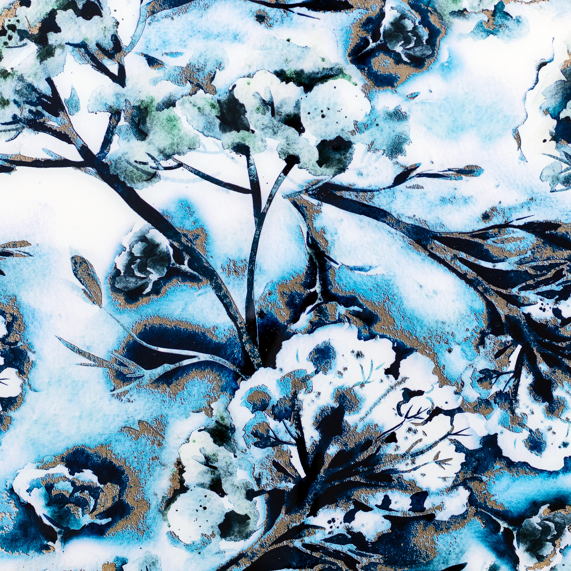 A gorgeous little black table with a gold rim around the top and a detailed illustration of white flowers with blue and gold highlights with matching gold features on the legs. The perfect side table to go with our matching serving trays in the same white flower design.
