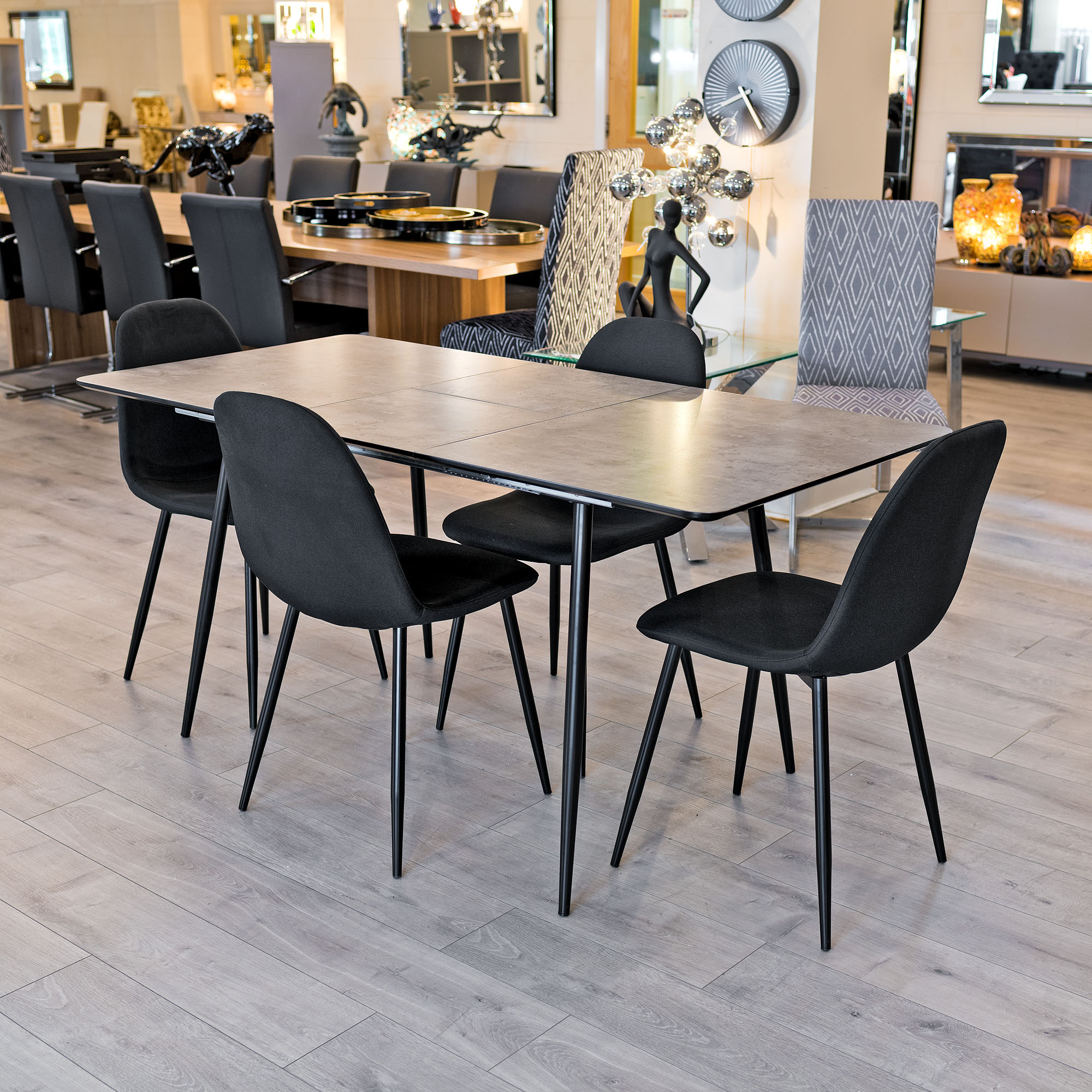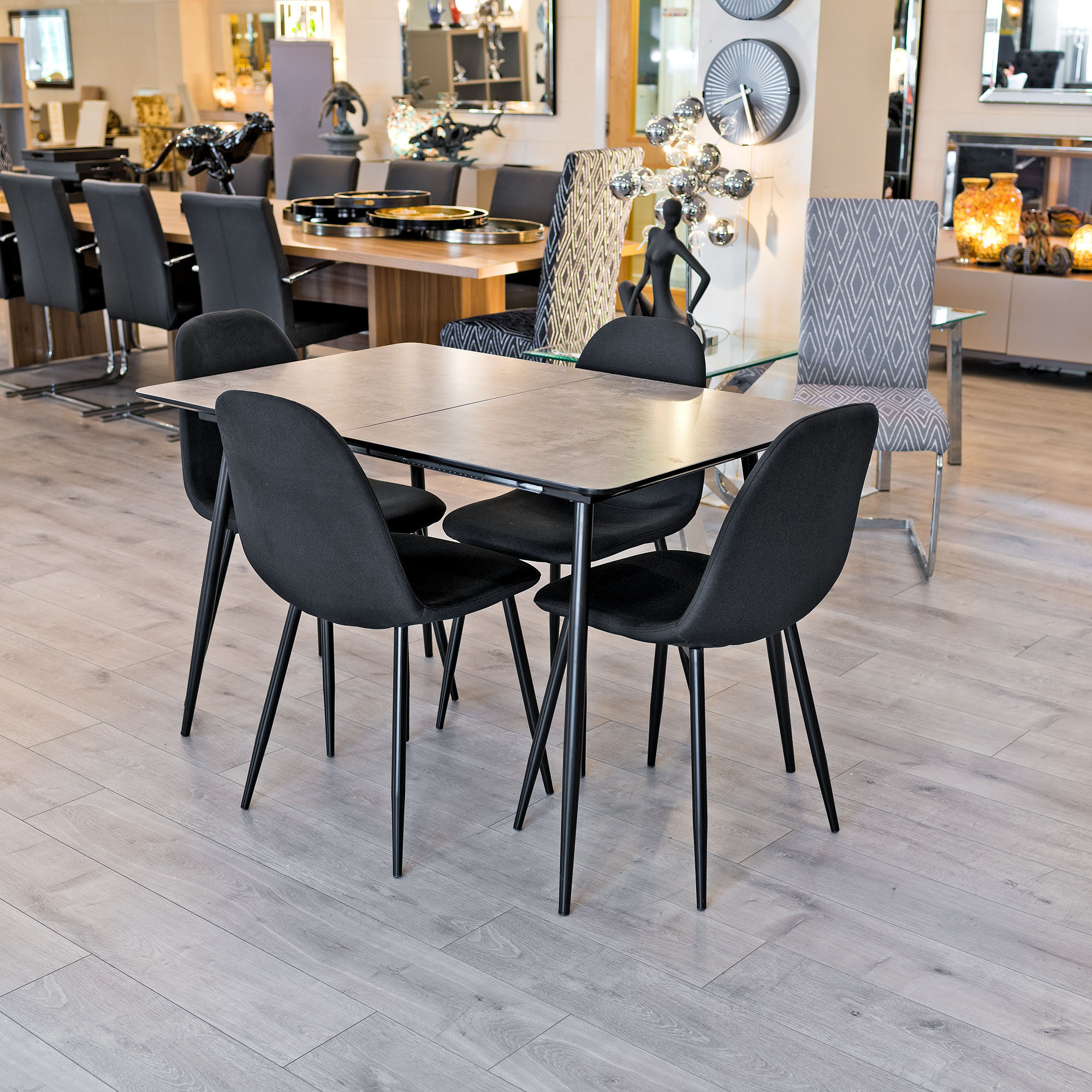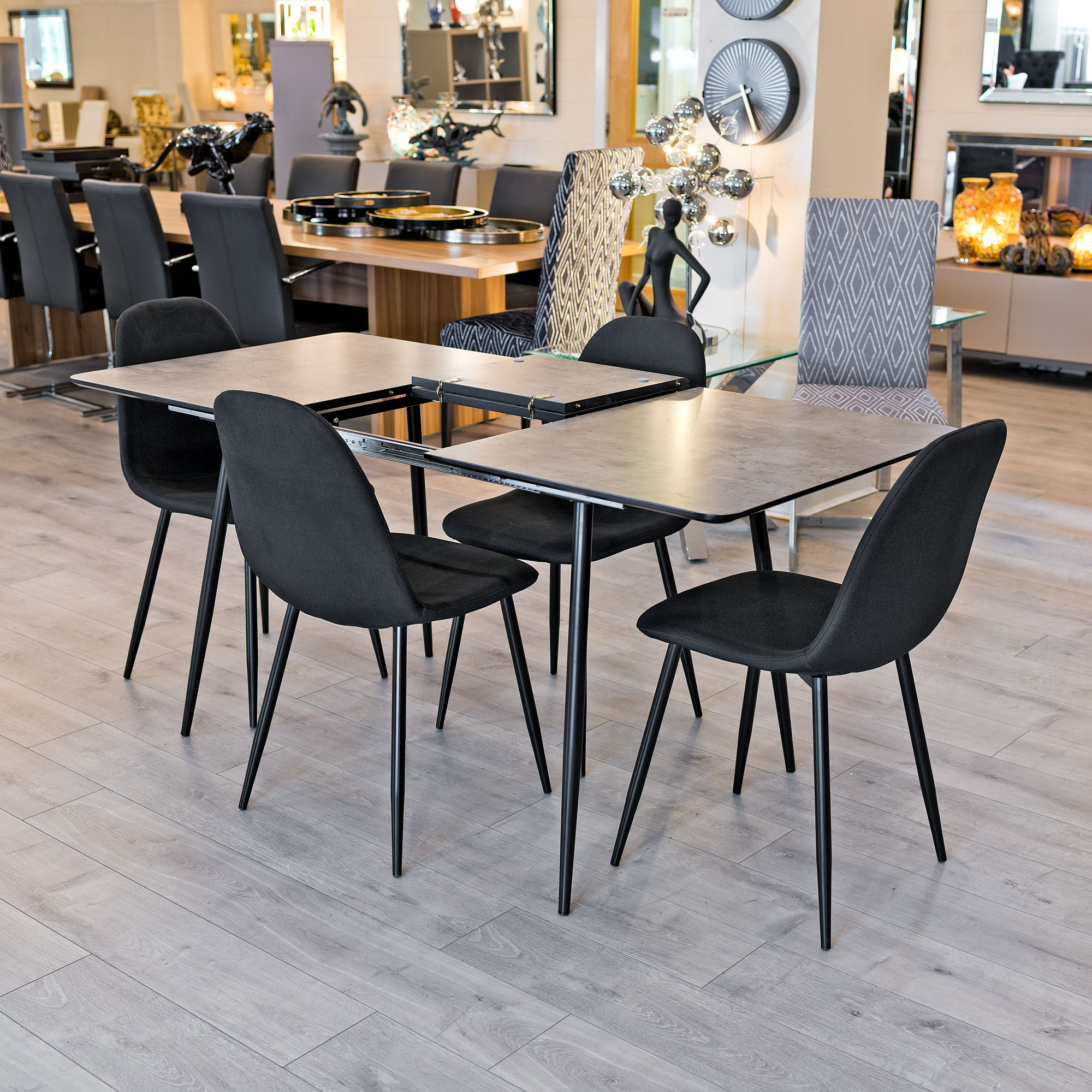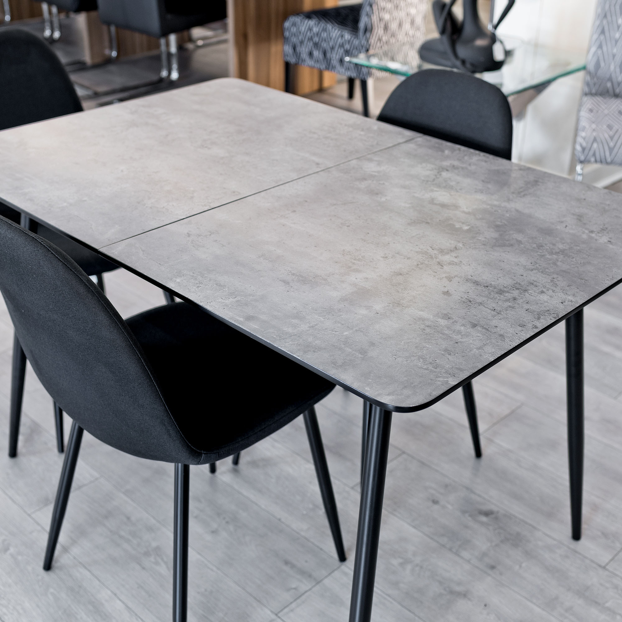 The Carleton Grey Extending Dining Table is a slim yet robust rectangular dining table with a fabulous Concrete Grey wood veneer finish supported by a black metal frame.