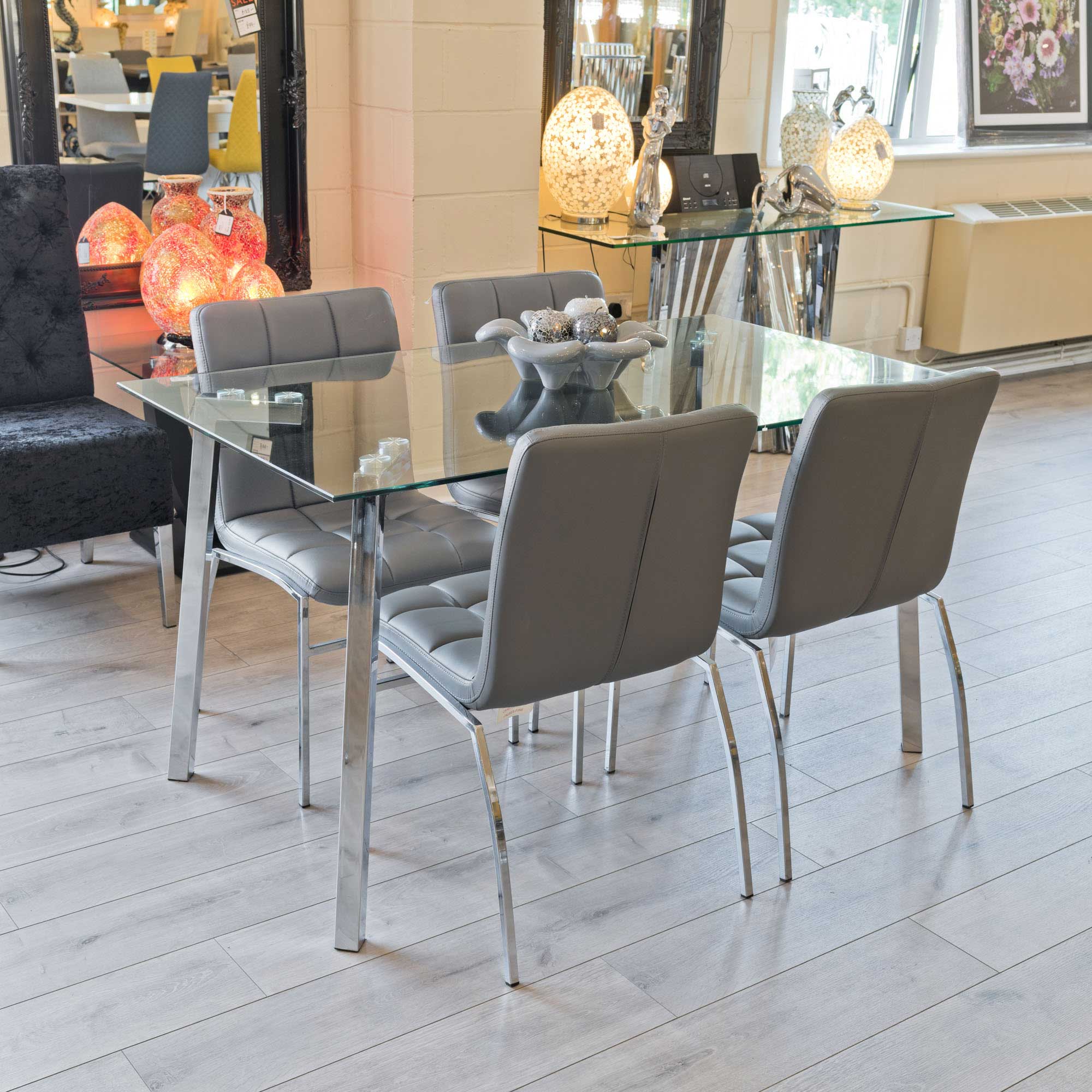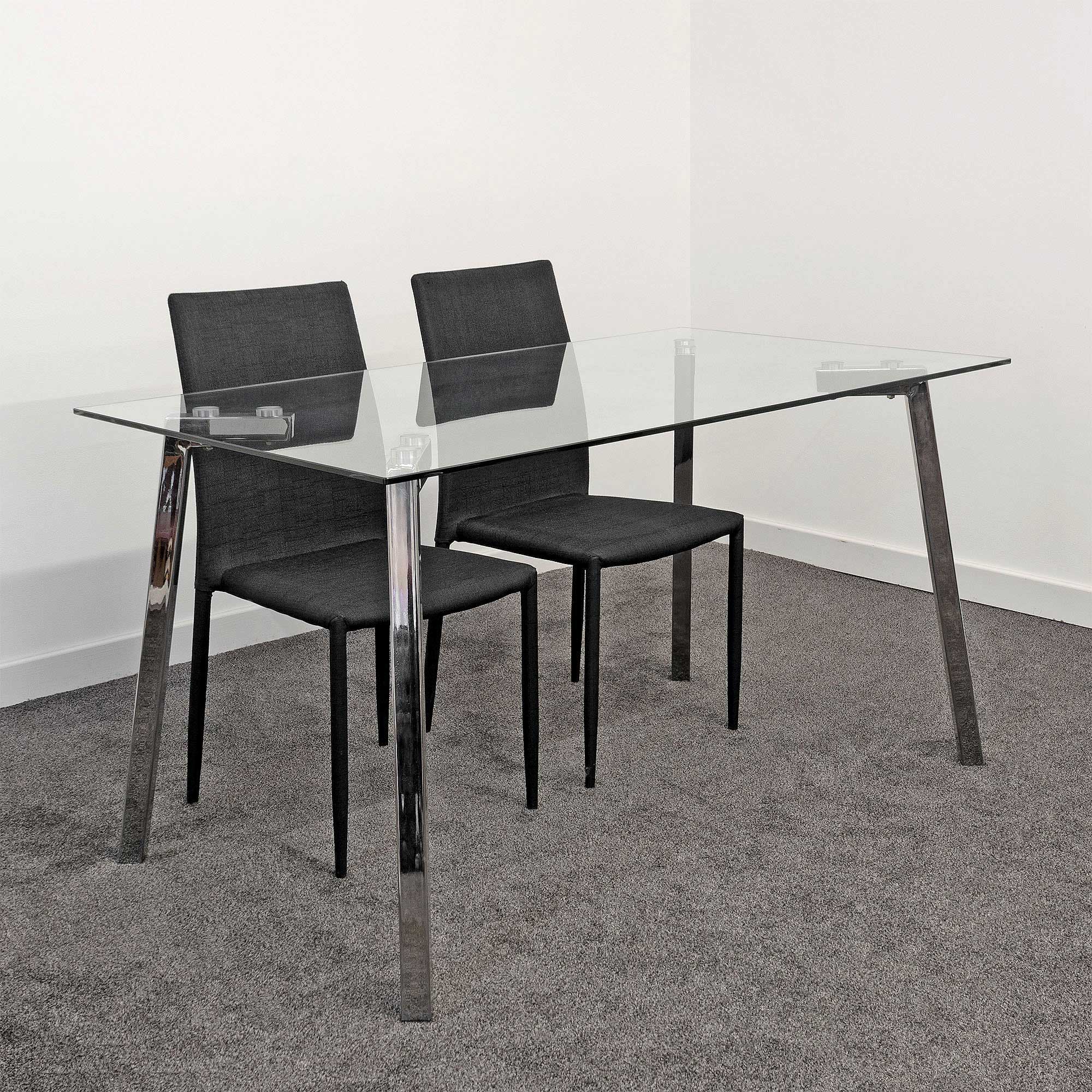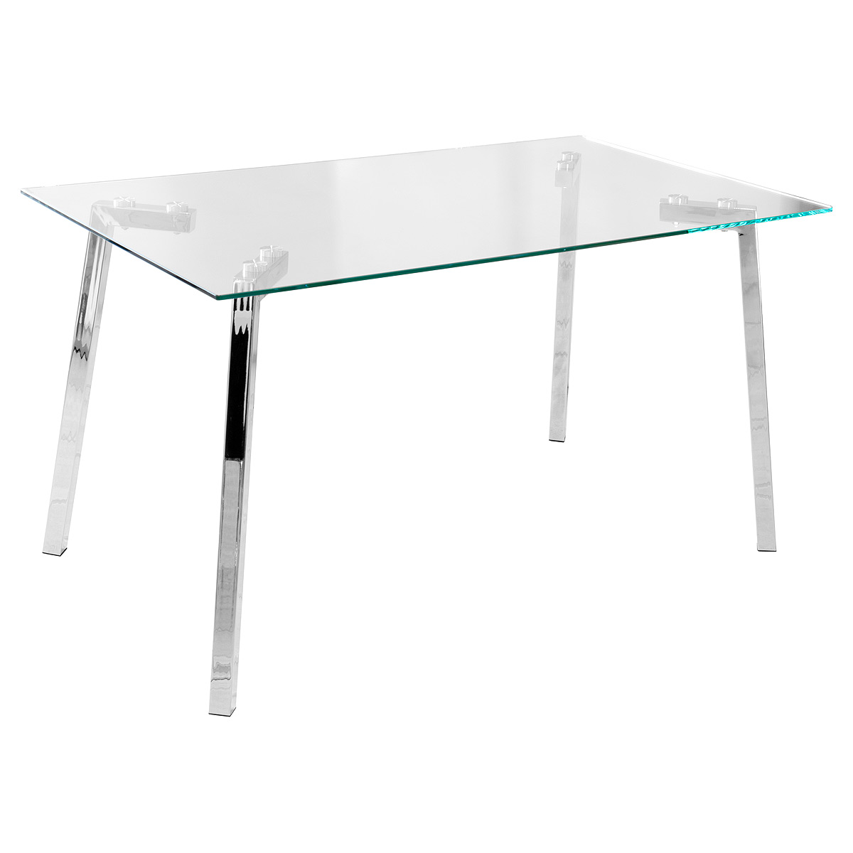 A simple but modern rectangular clear glass dining table supported by four metal legs.
