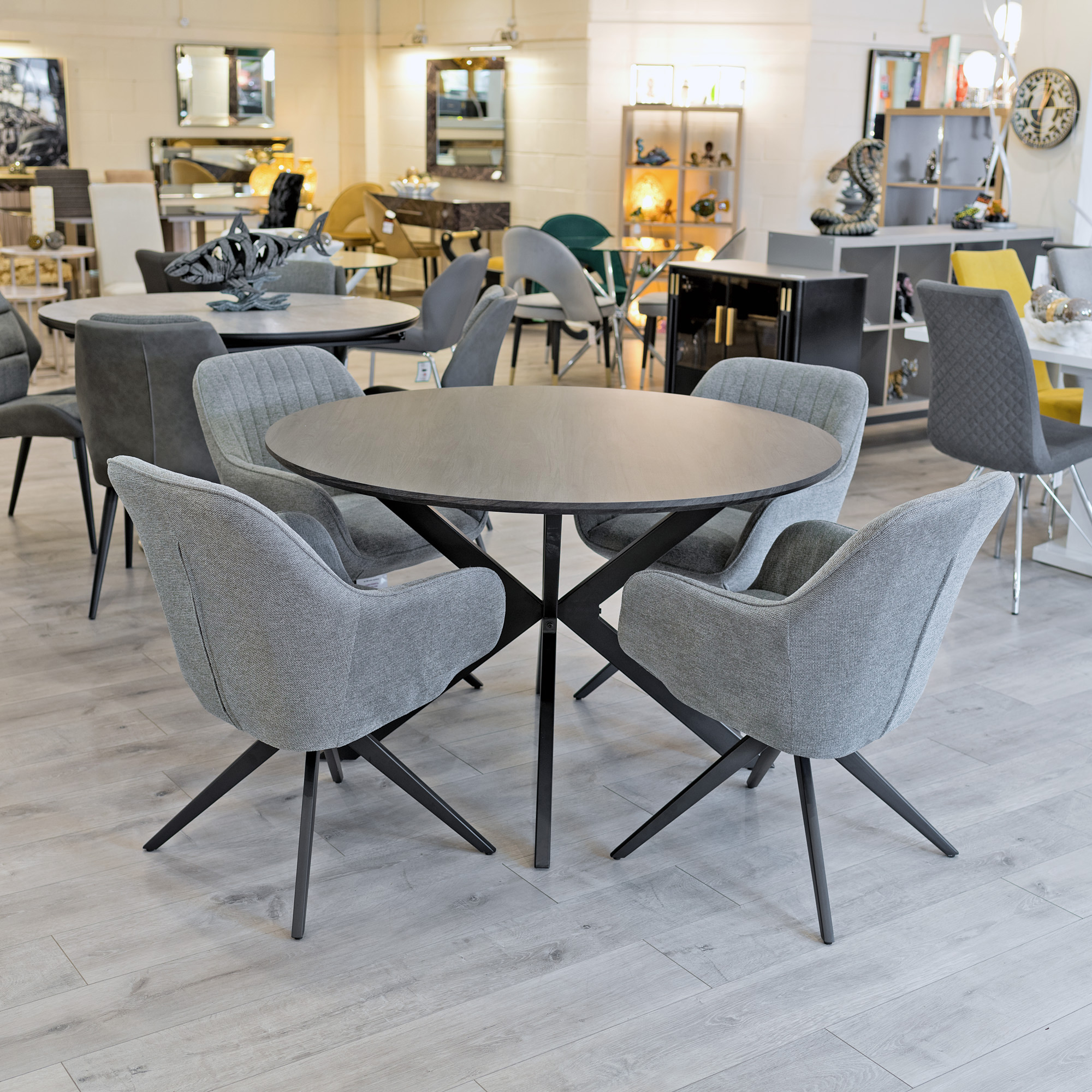 The Mythop dining table set is a thick circular dining table with a fabulous dark grey wood veneer finish supported by a black metal frame, comes with four matching light grey fabric dining chairs.