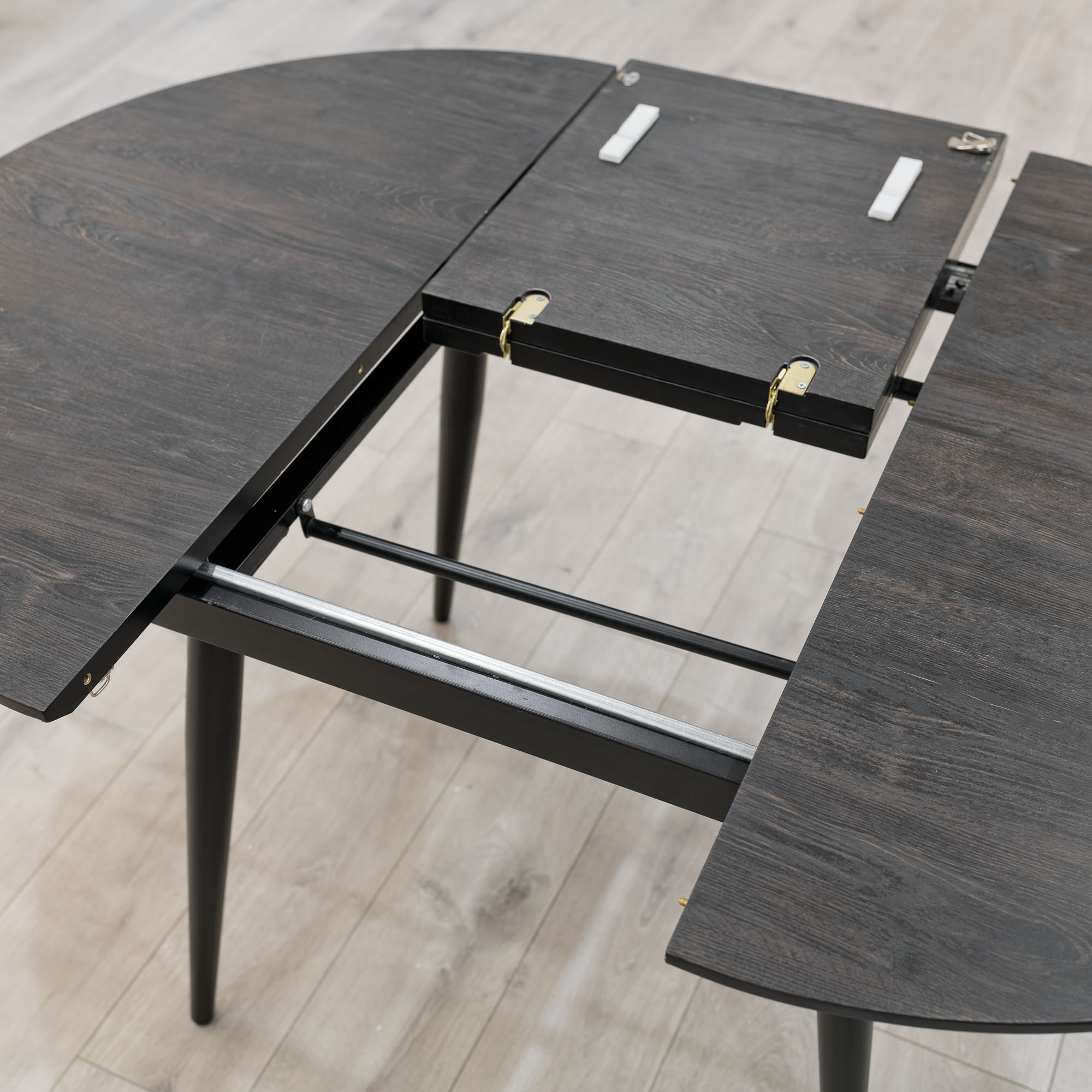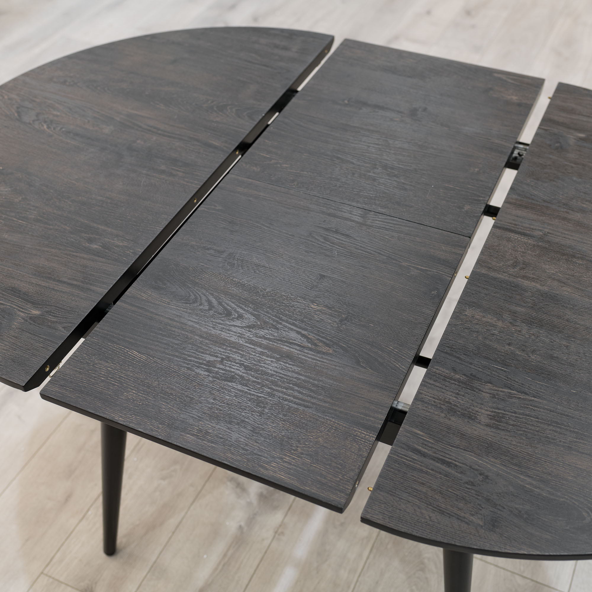 The Thornton Black Extending Dining Table is a slim yet robust circular dining table with a fabulous Black Ash wood veneer finish supported by a thick black metal frame.