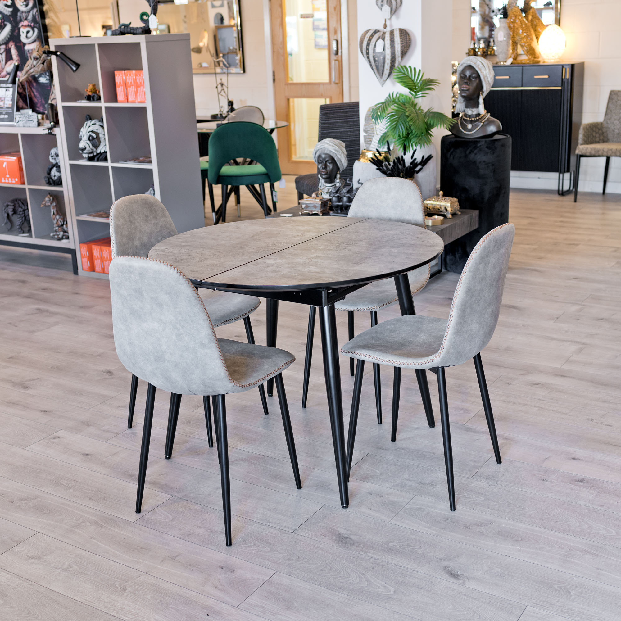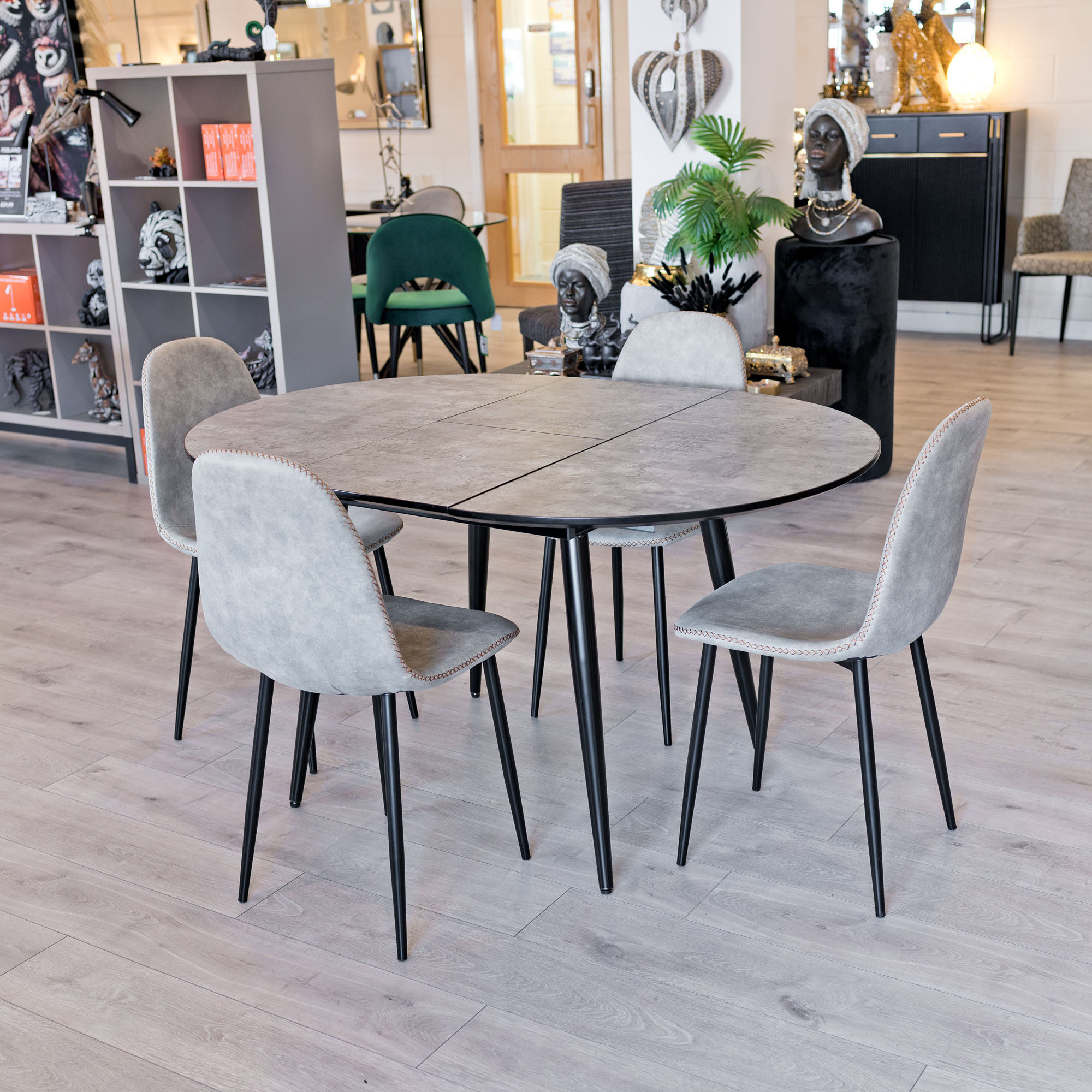The Thornton Grey Extending Dining Table is a slim yet robust circular dining table with a fabulous concrete grey wood veneer finish supported by a thick black metal frame.