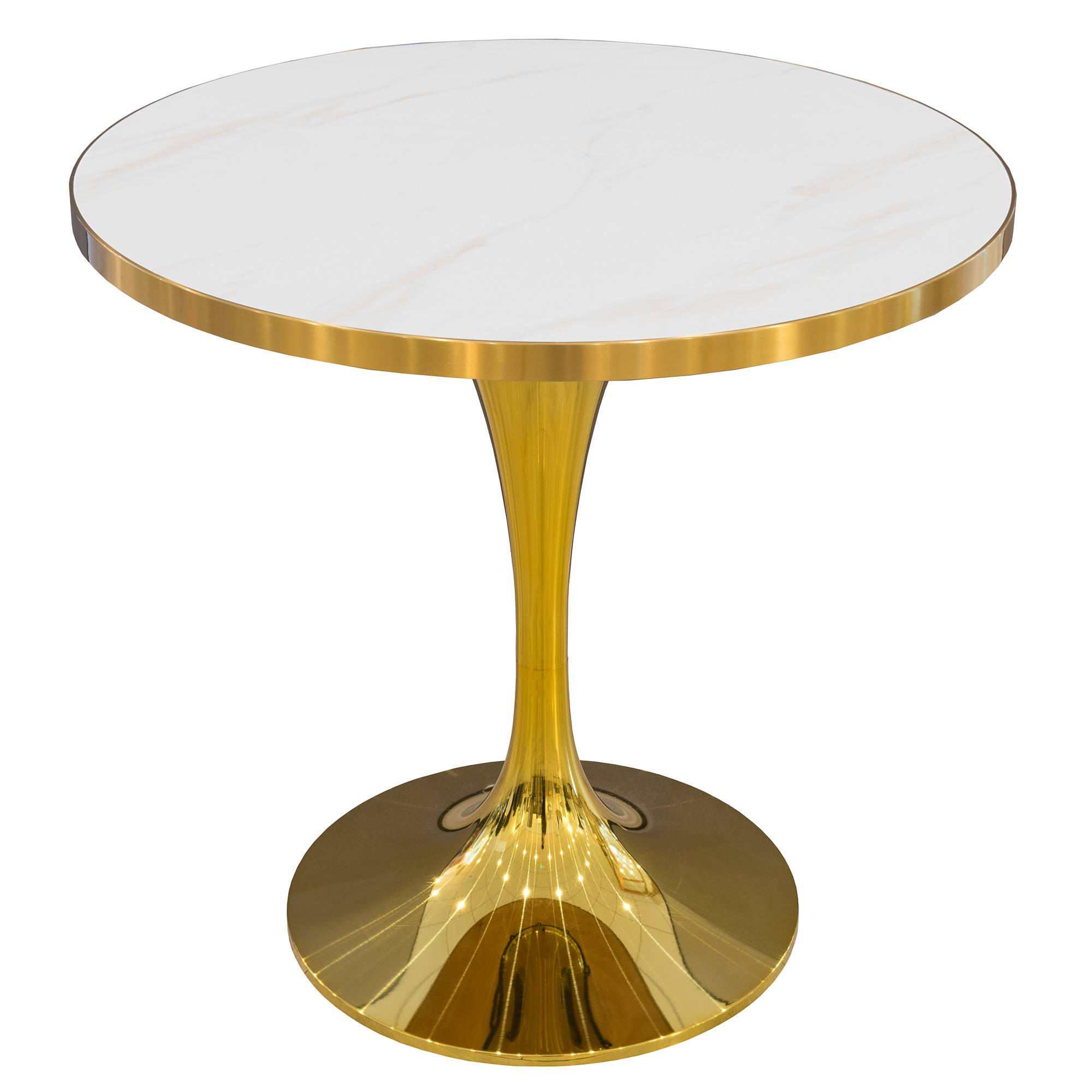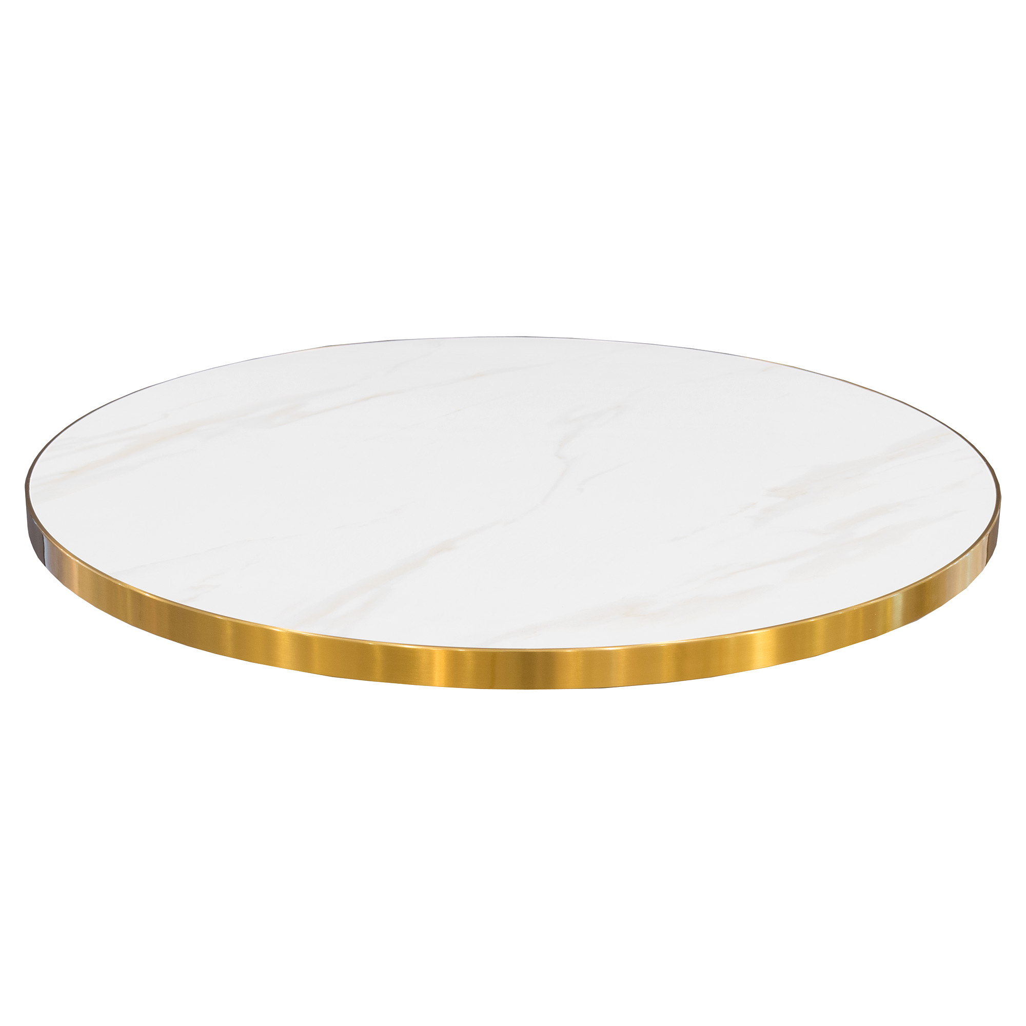 A large and luxurious ceramic 80cm round table top in white marble with a gold edge, goes perfect with our selection of contract table bases.