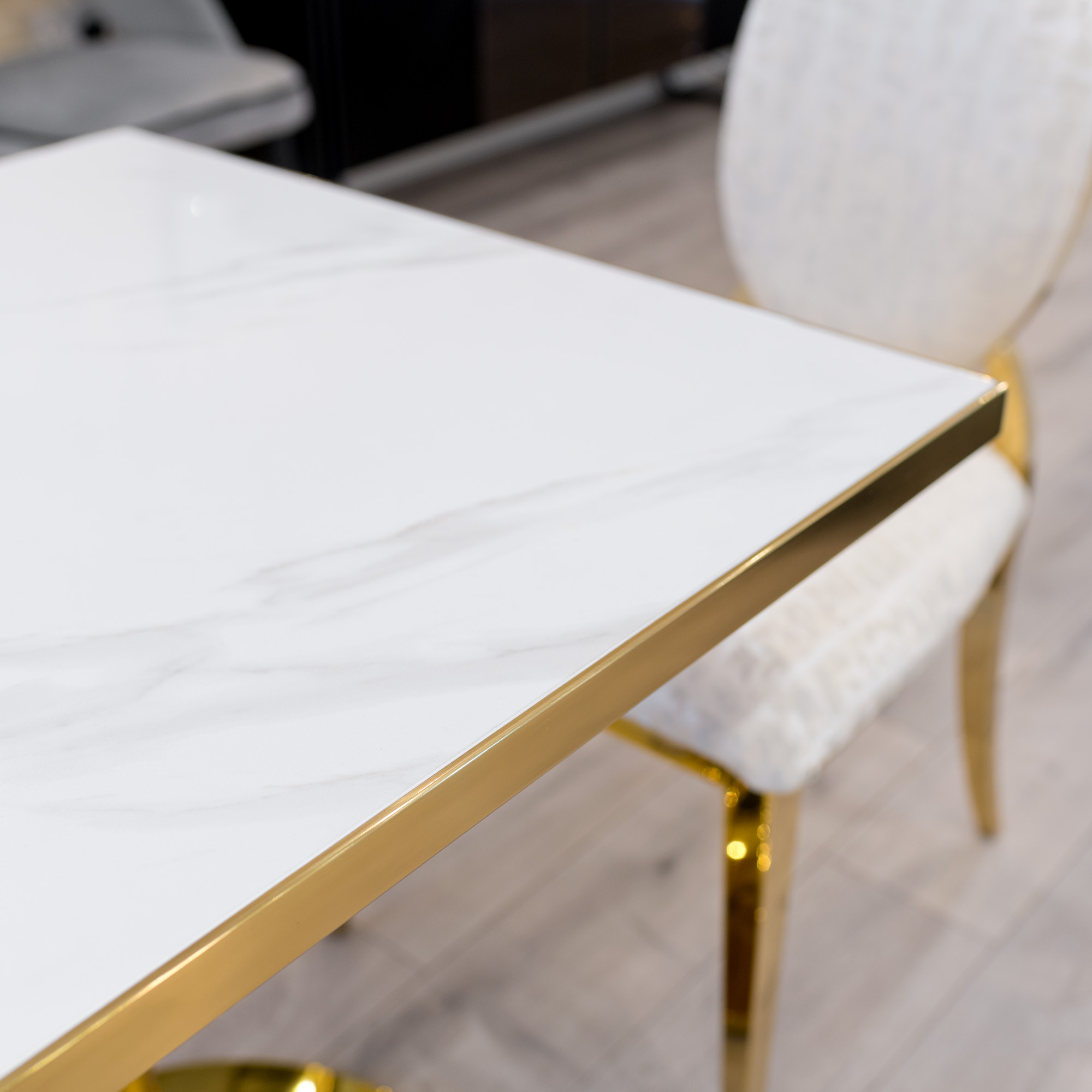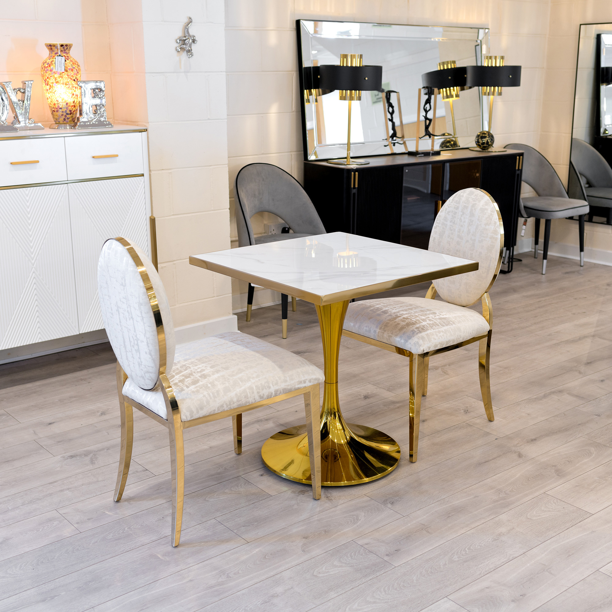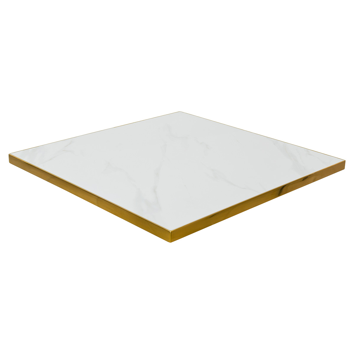 A luxurious ceramic 71cm square table top in white with a gold edge, goes perfect with our selection of contract table bases.