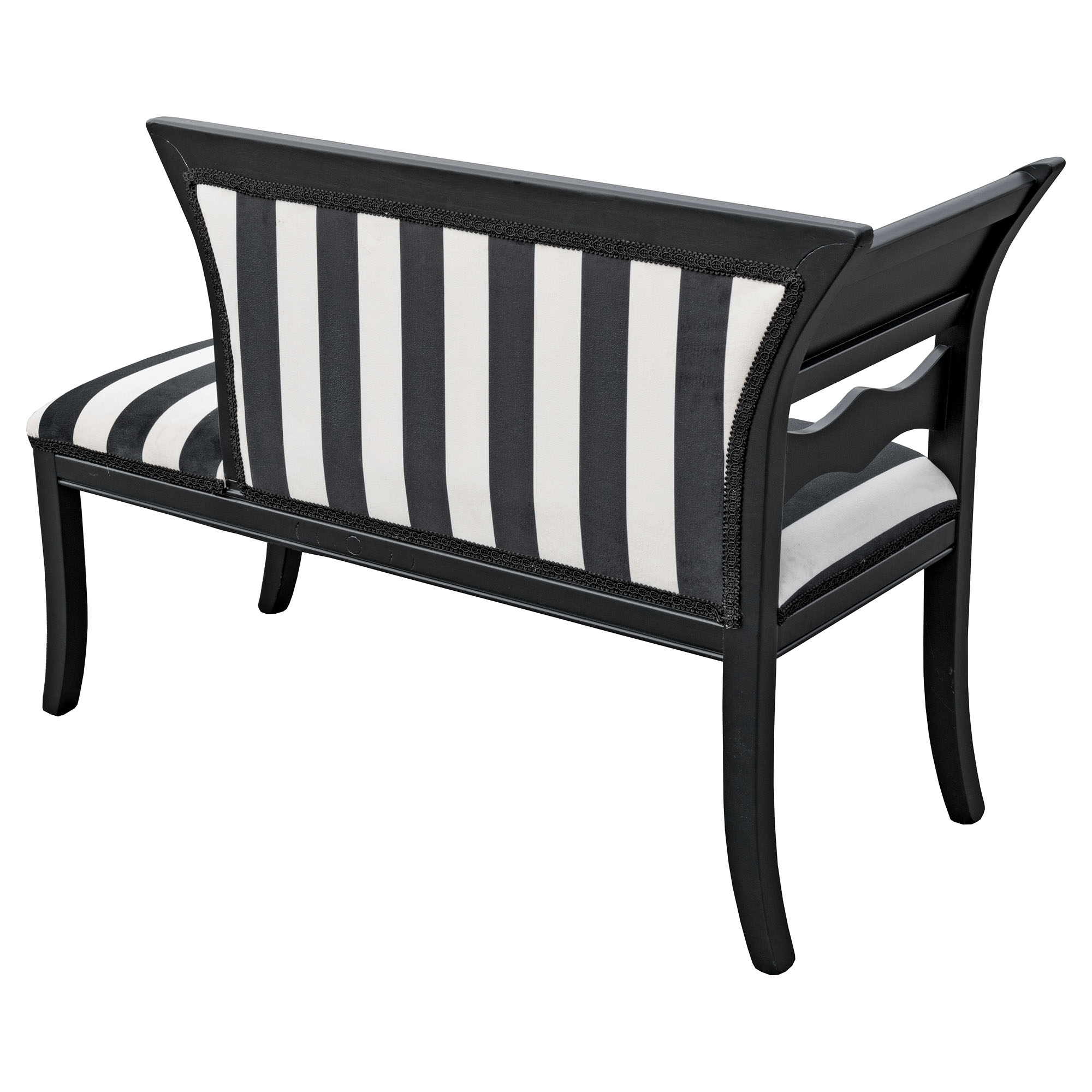 A unique bespoke black and white stripe fabric chaise with a matte black frame.