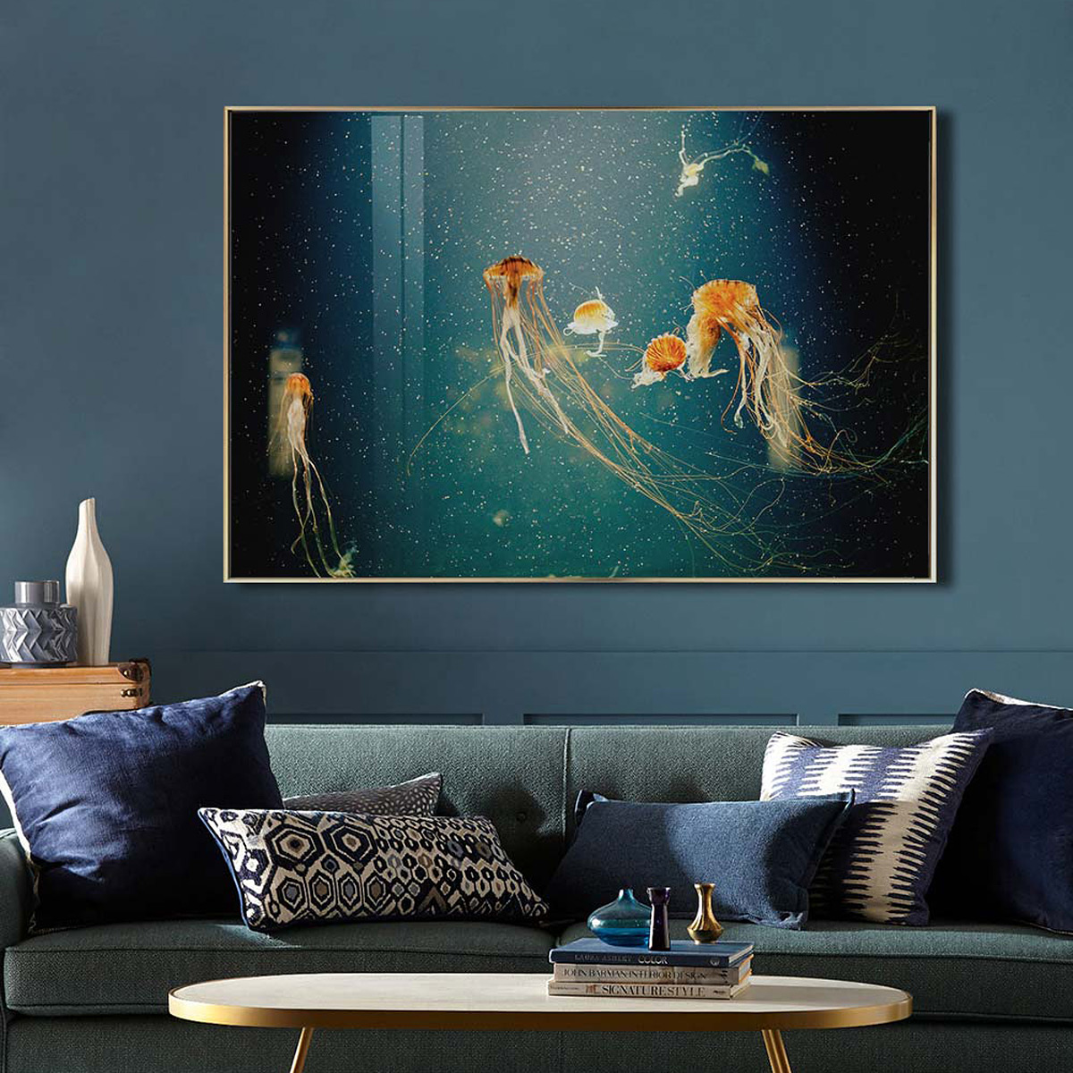 Add a splash of colour to your home decor with this beautiful Jellyfish Glass Wall Art.
