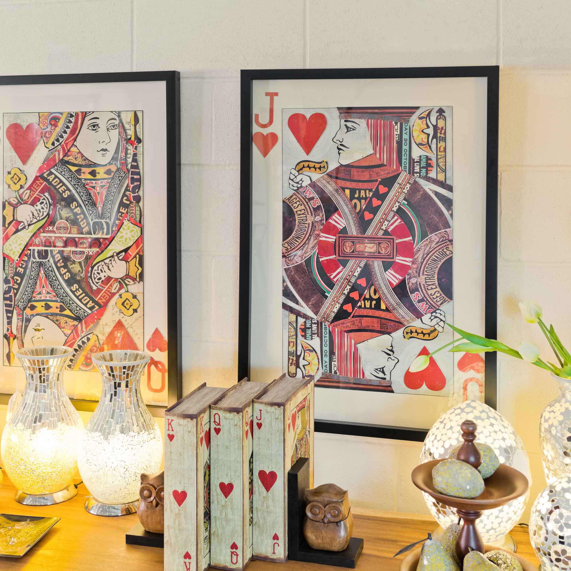 A fantastic and detailed collage of the classic playing card, the jack of hearts displayed in a glass case picture frame. These fabulous modern art pictures have layer upon layer of style and character.