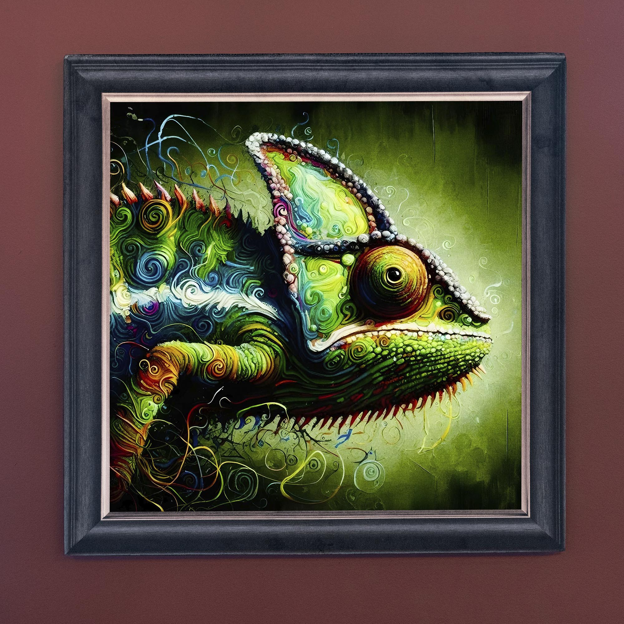 The Colourful Chameleon illusion artwork, crafted using high-quality French velvet, where the frame is cleverly printed as part of the artwork