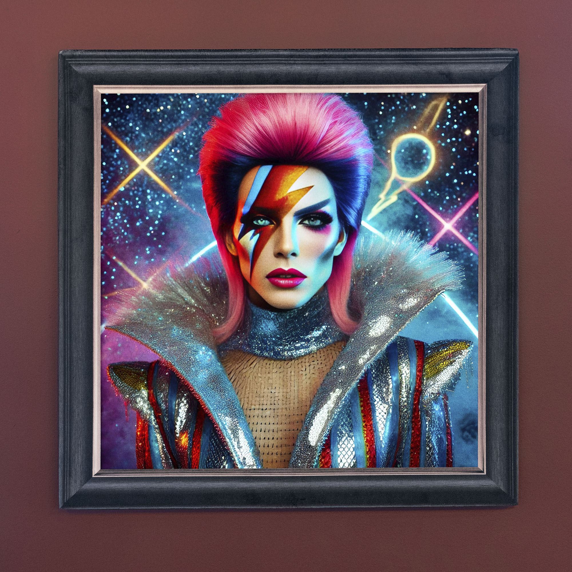 Velvet Illusion Artwork of the Glam Rocker picture in an 85 x 85cm or 55 x 55cm dark wood frame effect velvet print.