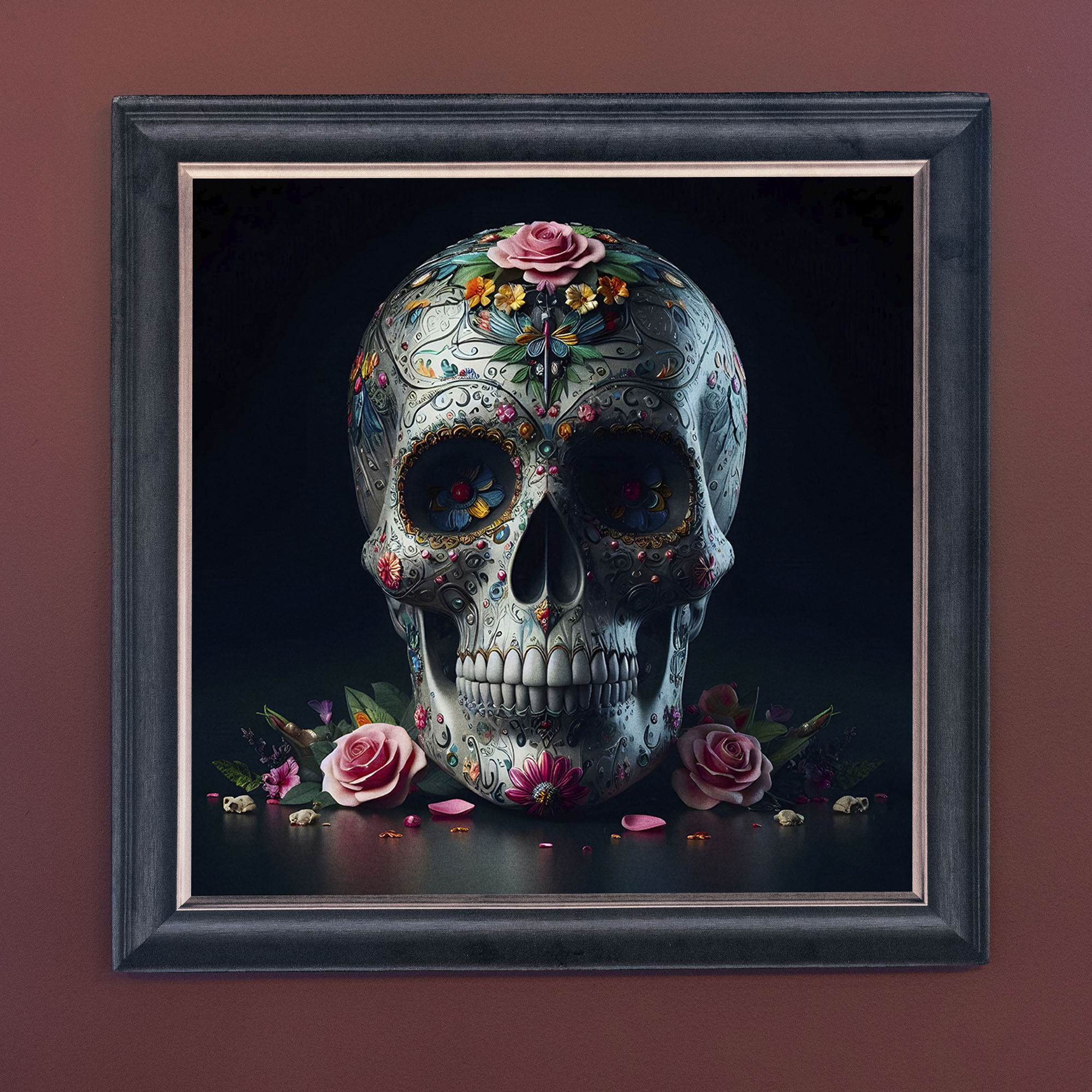 The Day of the Dead Skull illusion artwork, crafted using high-quality French velvet, where the frame is cleverly printed as part of the artwork