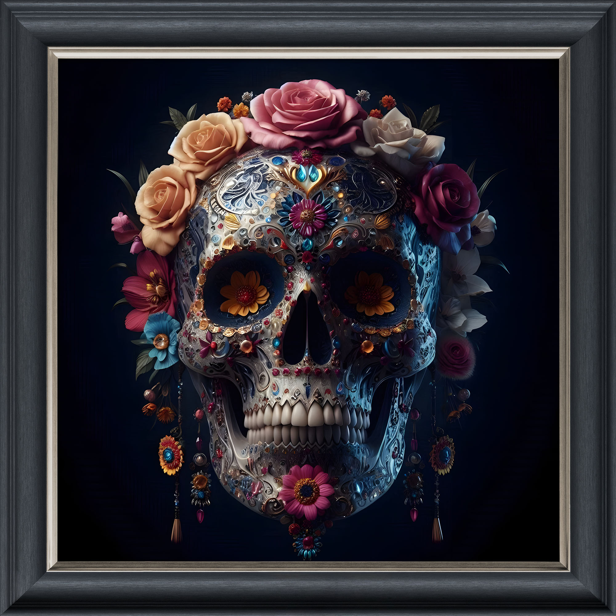 Velvet Print Framed Artwork in an 55 x 55cm black matte frame in the "Decorated Skull" design. Height : 55cm, Width : 55cm, Depth : 3.5cmRRP : £169.99