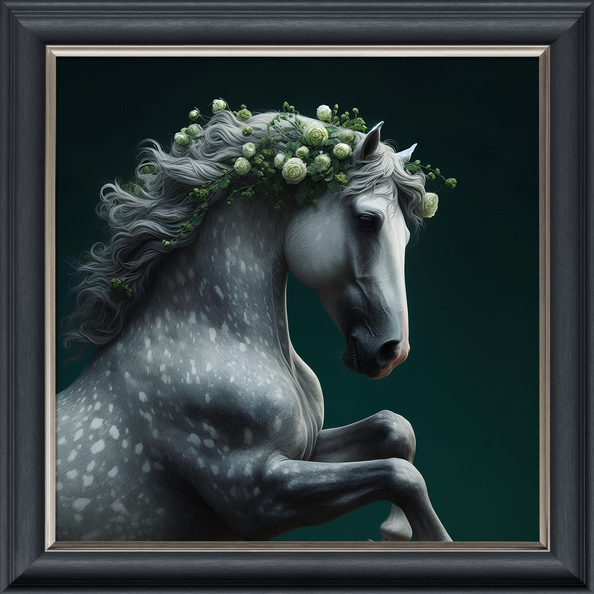 Velvet Illusion Artwork of the White Flower Horse in an 85 x 85cm or 55 x 55cm dark wood frame effect velvet print.